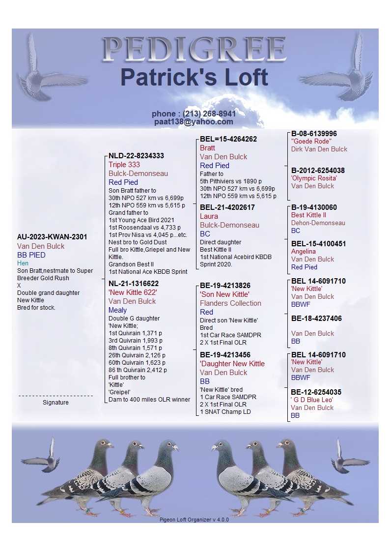 AU-2023-KWAN-2301 BB PIED hen, medium in size, well bulit,grand daughter to Bratt, nestmate to Gold Dust,full brother to Kittle, dam is a double grand daughter New Kittle,foundation quality!!!!!!!! check ped for more info.