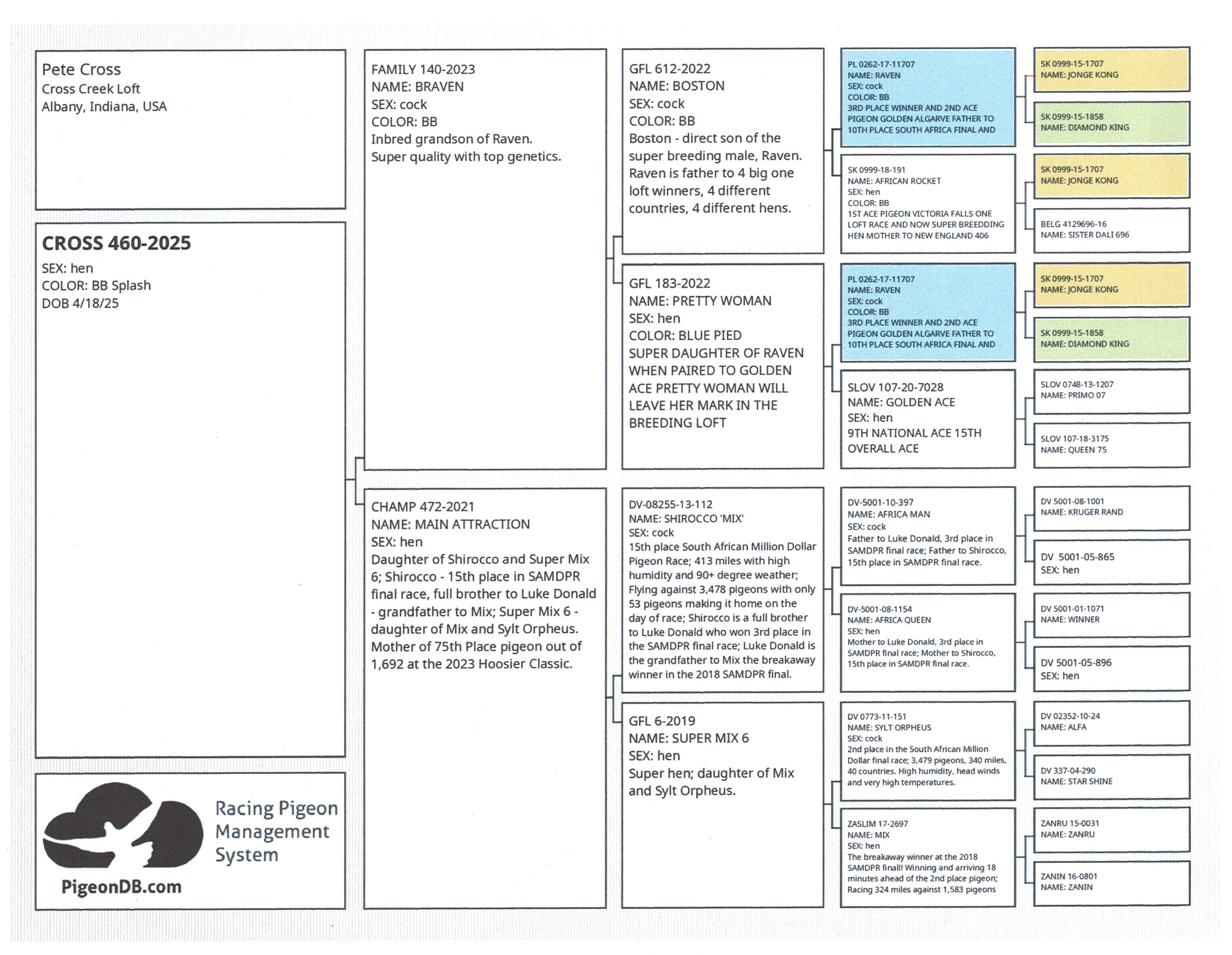 Mother - Champ 472-21, "Main Attraction," direct off Shirocco, 1st Place SAMDPR 413 miles, hot & head winds vs. 3478 pigeons, with only 53 day birds. He is also full brother to Luke Donald, 3rd Place winner SAMDPR.