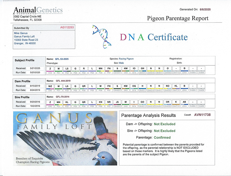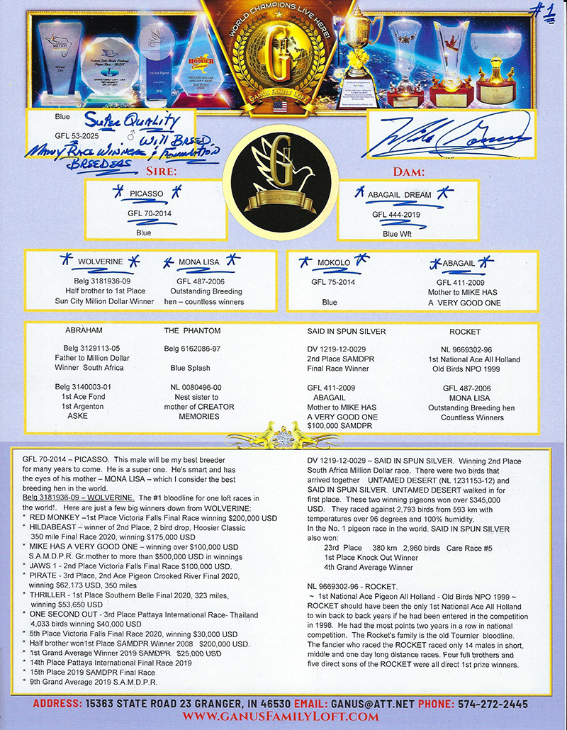 GFL is proud to breed from some of the most recognized and legendary winning bloodlines in the sport. An achievement accomplished by winning in almost every top USA and international one loft races. This pedigree has the winning genetics: WOLVERINE, MONA LISA, ABAGAIL..