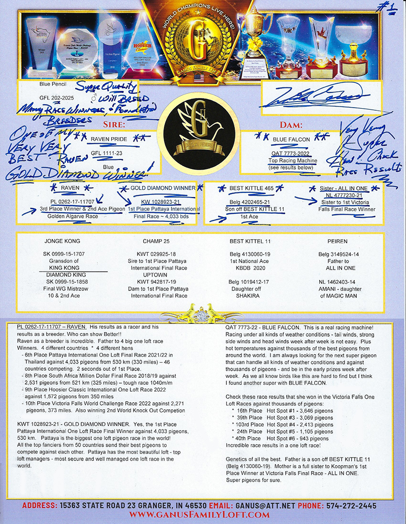 Sire: RAVEN PRIDE – son of RAVEN (3rd Golden Algarve Final and 2nd Ace Pigeon. Father to 4 big one loft race winners, see pedigree) and GOLD DIAMOND WINNER (1st Place Pattaya Final Winner against 4,033 birds.)