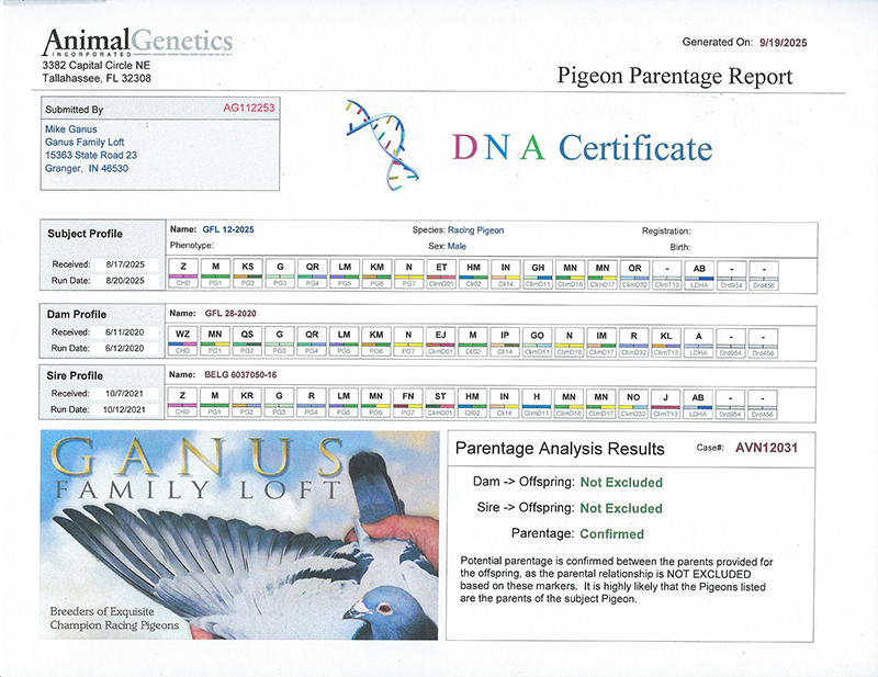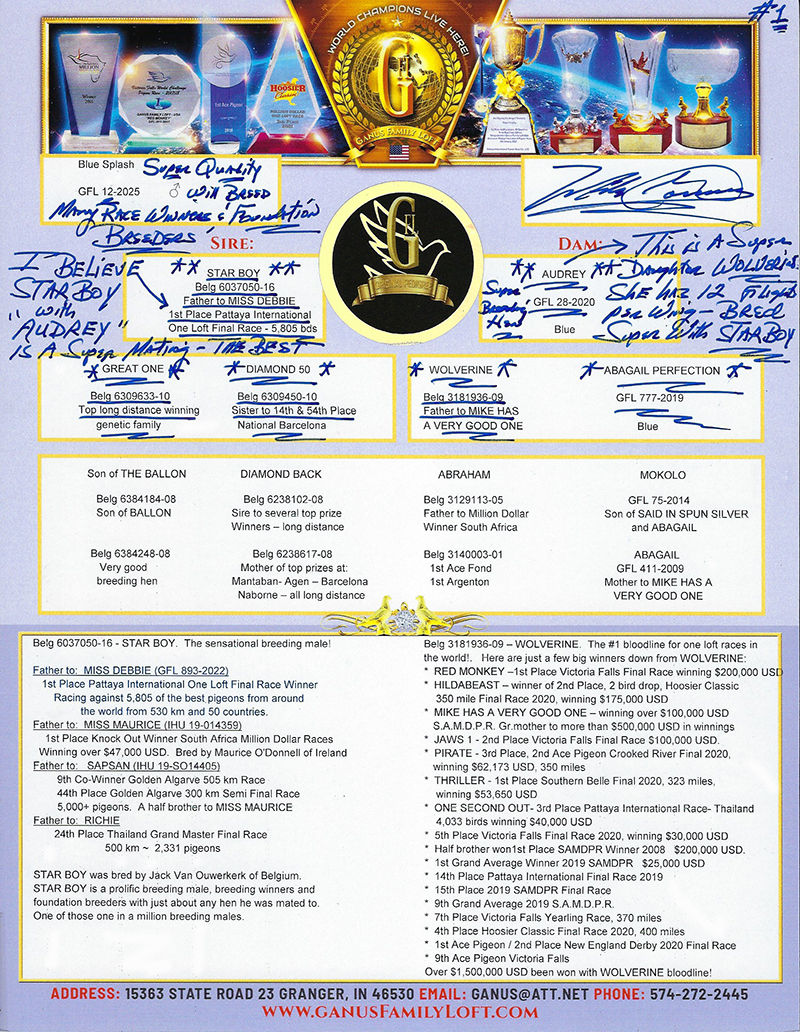 Dam: AUDREY – a daughter of WOLVERINE – the legendary breeder for GFL with offspring scoring in almost every well known international and USA one loft race. Look at pedigree to see just some of WOLVERINE’s accomplishments. Quite impressive!