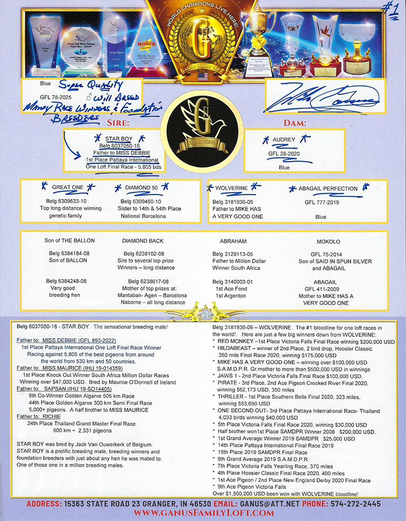 Sire: STAR BOY – father to MISS DEBBIE – 1st Place Winner Pattaya Int.