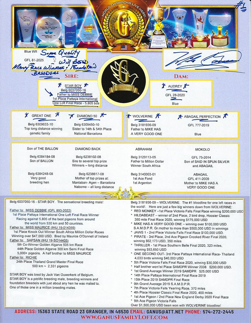 One Loft Final Race against 5,805 birds. Also father to: