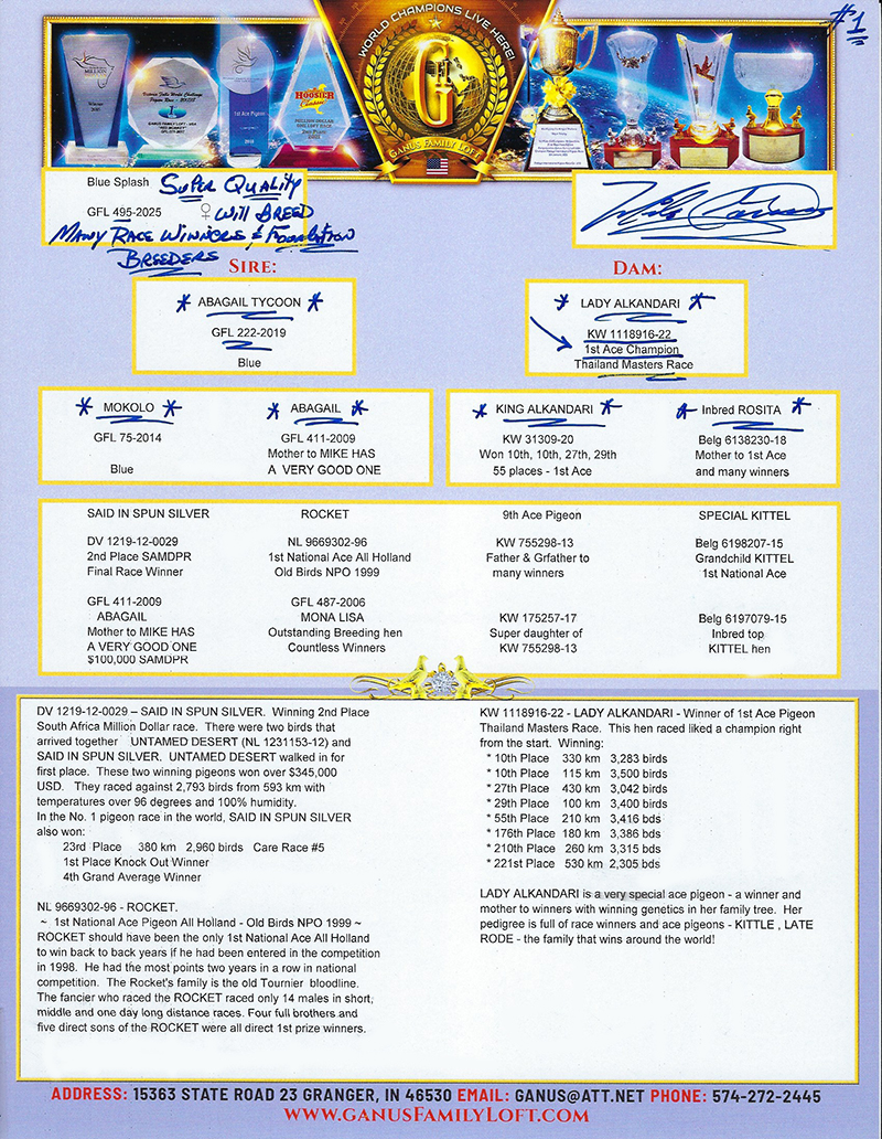 Dam: LADY ALKANDARI – 1st Ace Pigeon Thailand Masters Race