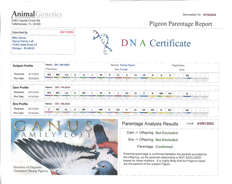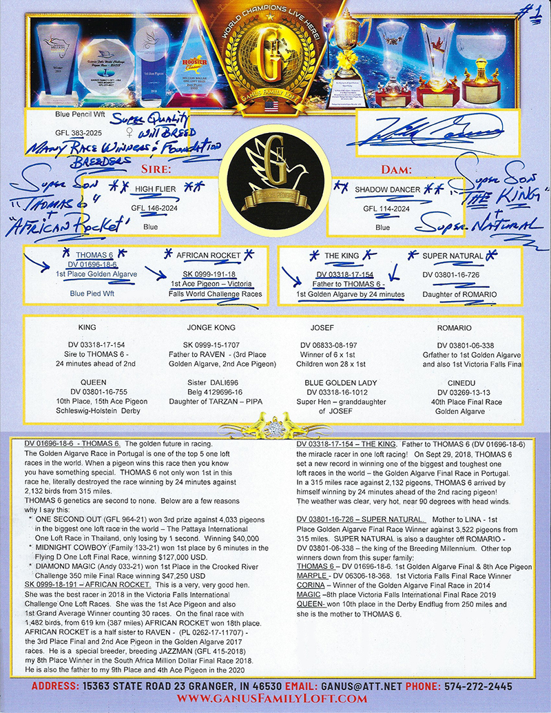 1st Place Crooked River Final) and AFRICAN ROCKET (1st Ace Pigeon
