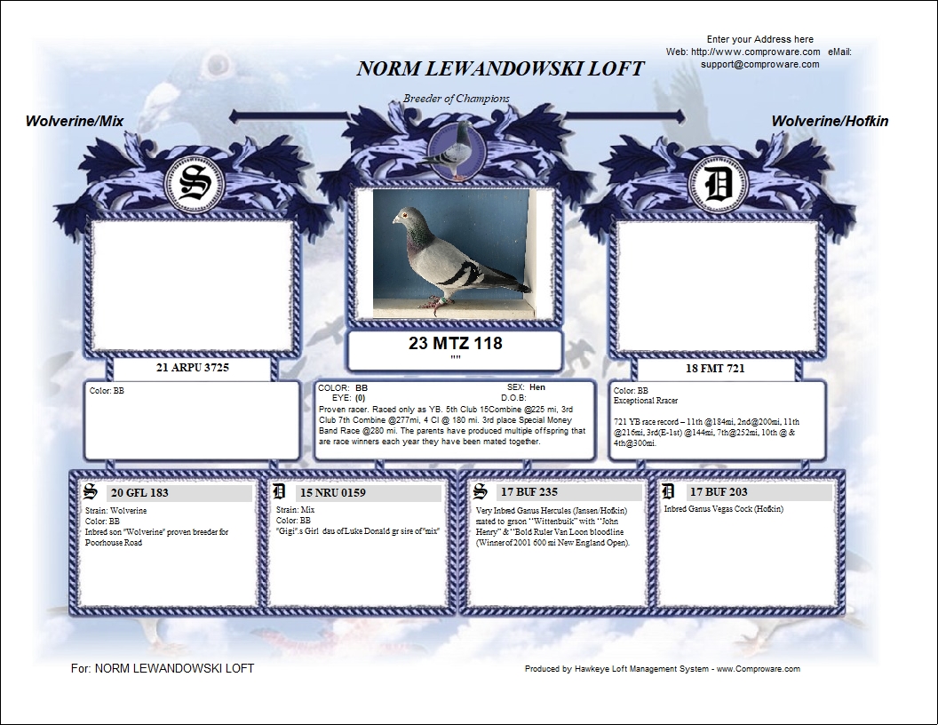 Proven racer. Raced only as YB. 5th Club 15 th Combine @225 mi, 3rd Club 7th Combine @277mi, 4 Cl @ 180 mi. 3rd place Special Money Band Race @280 mi. Combine races are 500-600 birds.The parents have produced multiple offspring each year that are top 10 race winners.