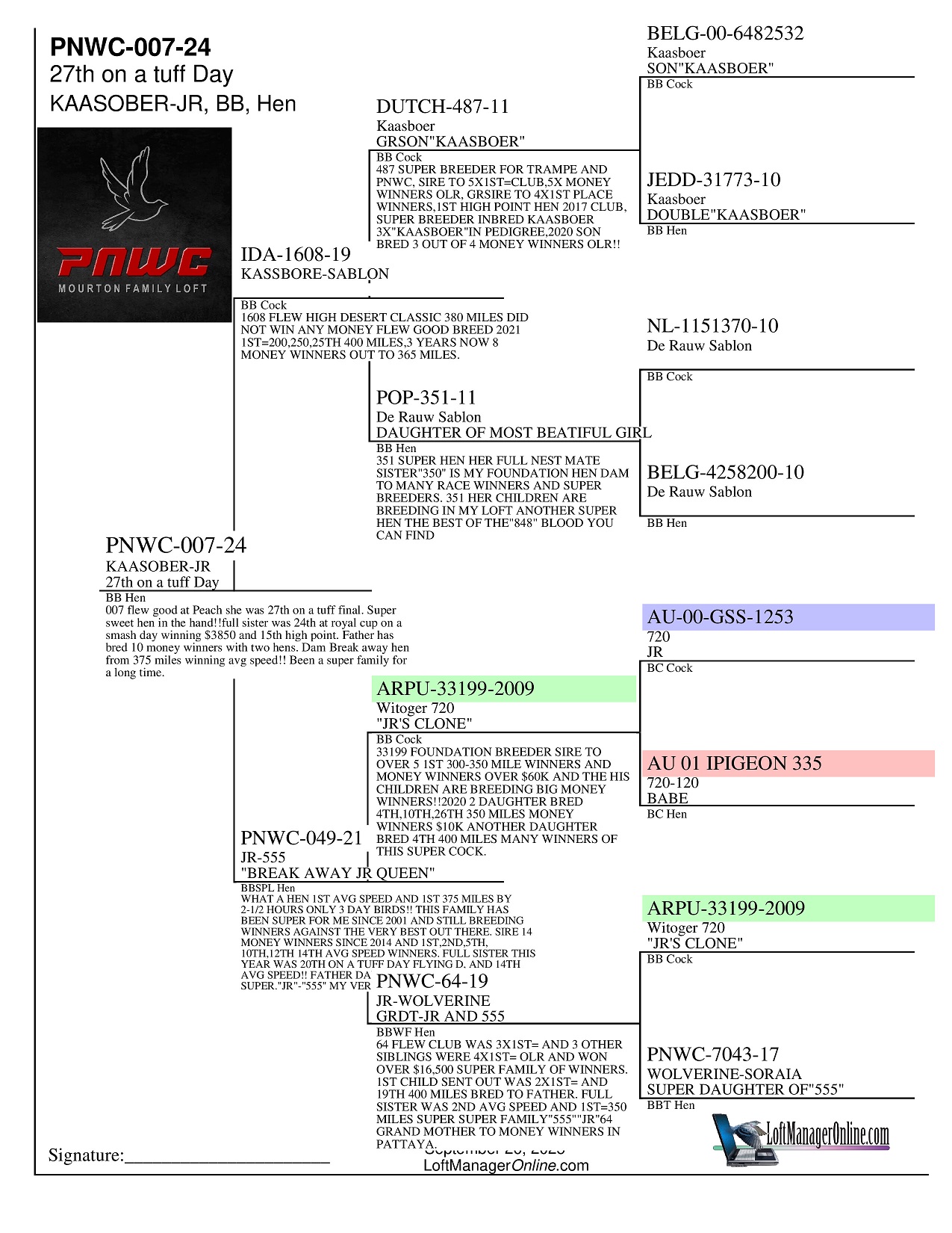 DOUBLE OO7 VERY NICE HEN LAST YEAR TWO FULL SIBLING WON MONEY ON THE FINAL BOTH VERY TUFF RACES. BOTH PARENTS HAVE BEEN ONE OF MY BEST BREEDERS. SHE HAS NOT BEEN BRED SUPER OLR BLOOD.