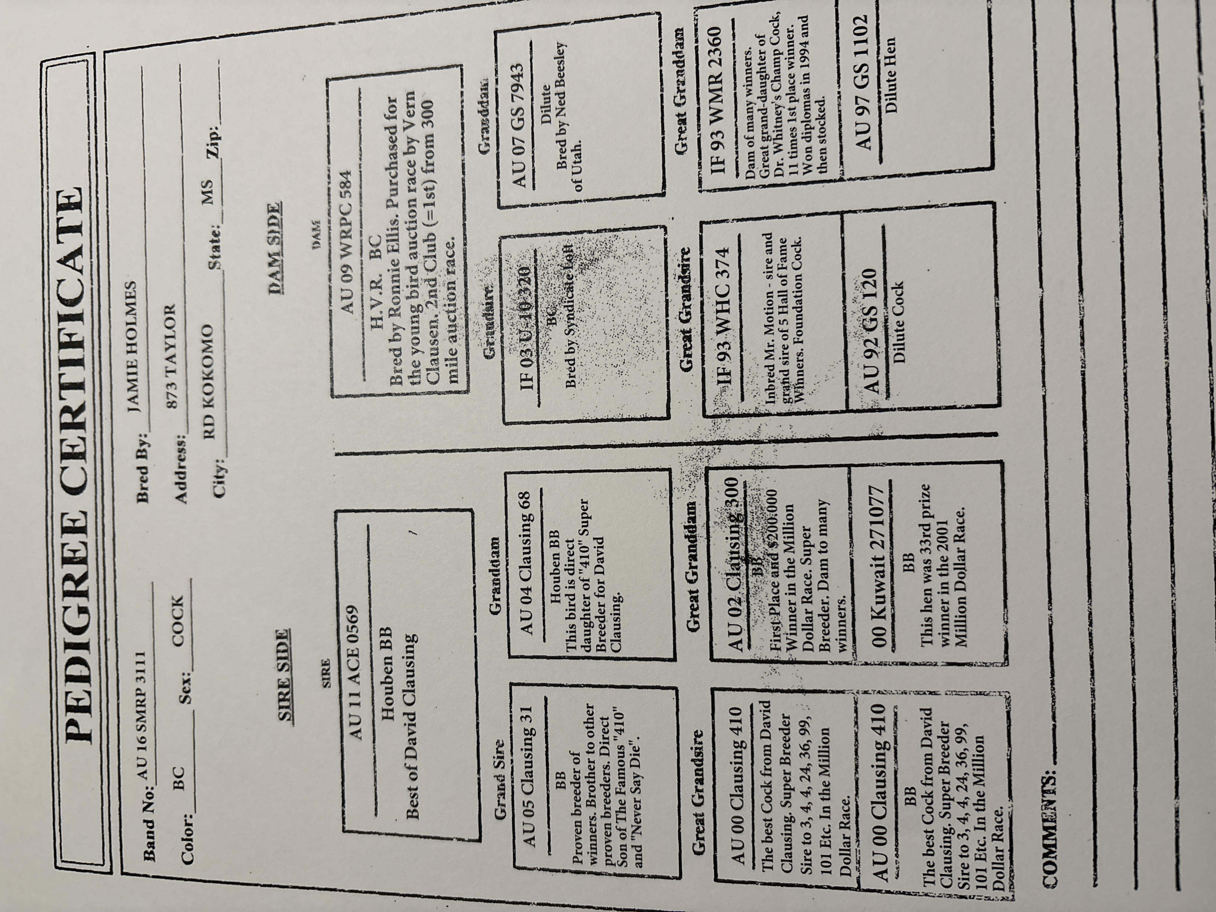A very nice 2025 late hatch. Ran out of bands so used an old band due to good bloodlines. These birds are doing great for me on the tuff races. Dam is from Long Distance AU Champion lines.