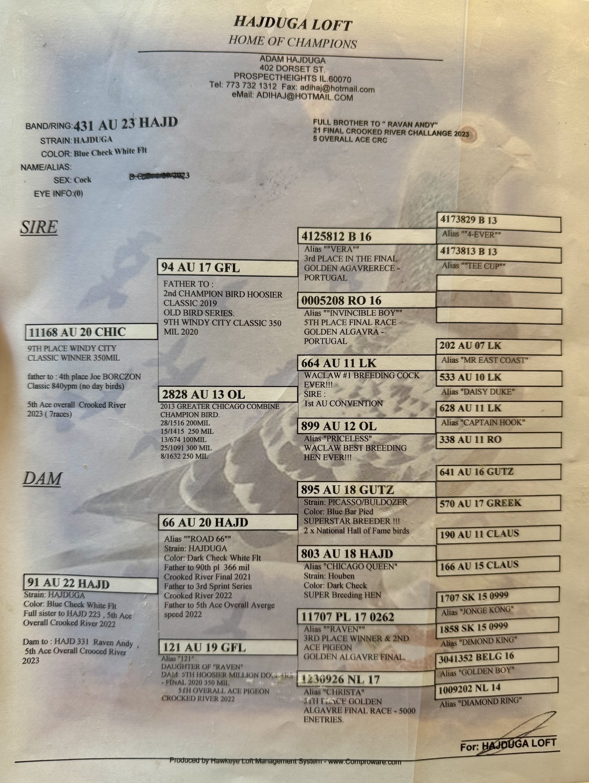 2023 late hatch. Very nice in the hand slick silky feathering, lots of plummage, very balanced bird with long flights. He is full brother to Hajdugas "Raven Andy" 2023 5th ace pigeon in the 2023 Crooked River OLR. He is almost done molting, and in great health. Check pedigree for more info.