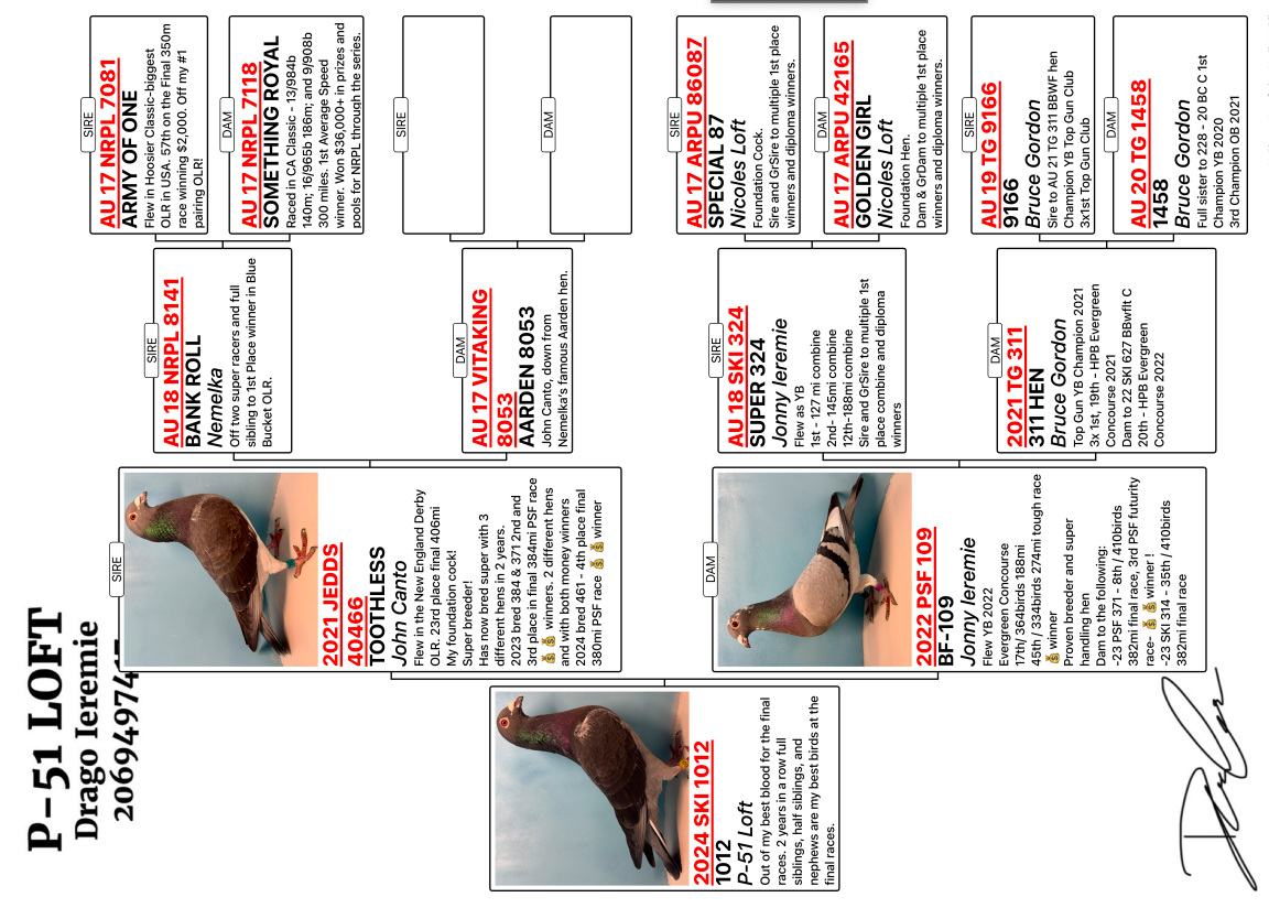 1012 is medium in size and longer cast with silky feathers, long flights. He damaged his wing on a training flight and was not able to race in the 2024 YB season, its hardly noticable flying in the loft. He is full brother and half brother to multiple top performers on the longer final races which is usually 360-380miles for me. Both sire and damn were flown. He looks alot more like the sire. Sire is my foundation cock "Toothless". He has produced top racers on the final races with 3 different hens, 2 years in a row. Dam is and excellent handling and breeding hen. Please check pedigree for more details.