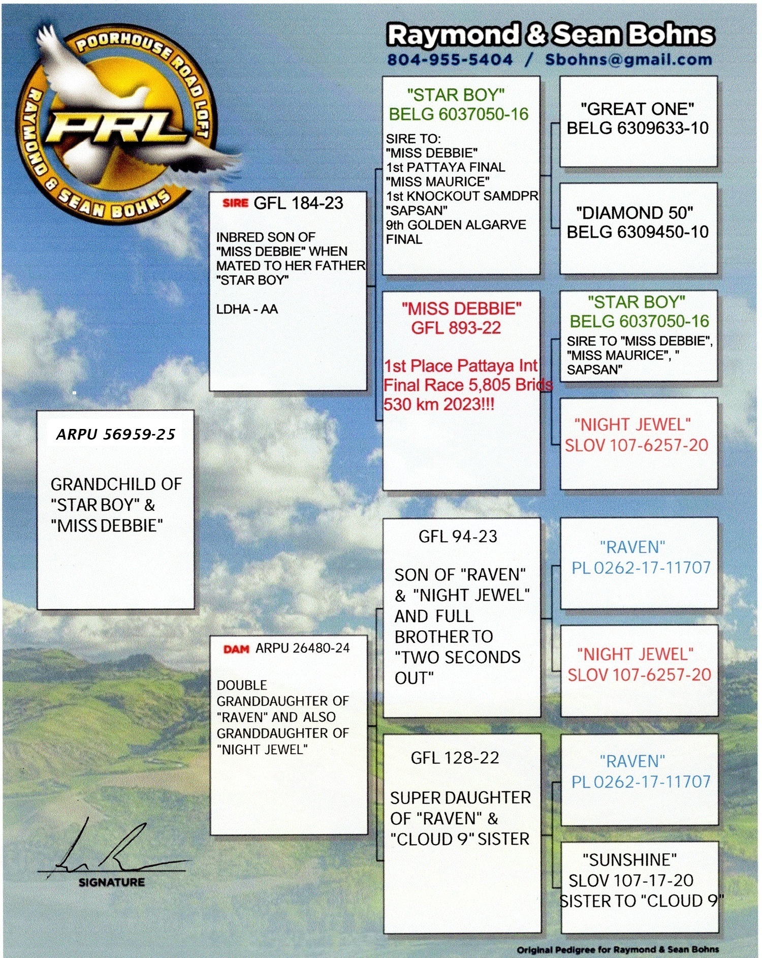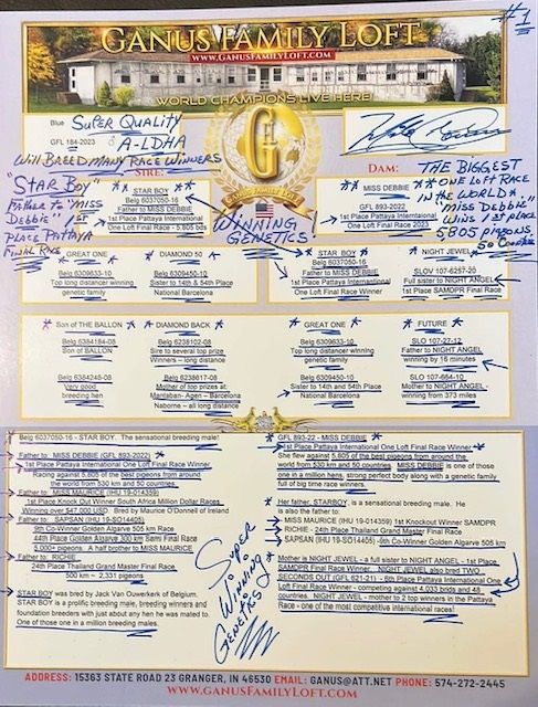 SIRE: GFL184-2023 (LDHA AA) A VERY VERY special cock!! Inbred SON OF “MISS DEBBIE” WHEN MATED BACK TO HER FATHER "STAR BOY" !!! “MISS DEBBIE” was 1st Place Pattaya International Final Race vs. 5,805 birds 530km winning $187,000. She then was bought back by Ganus Family Loft for over $150,000!!! She is a direct daughter of “Star Boy” & “Night Jewel”. Her half brother “TWO SECONDS OUT” was 6th Place Pattaya International Final Race vs. 4,033 birds 530km losing by only 2 seconds. He is a direct son of “Raven” & “Night Jewel”. "Star Boy" is also father to "MISS MAURICE" 2019 SAMDPR Knockout Winner and now top breeder for Lamons Family Loft!! This is the best OLR families in the world and a very special mating!!!!
