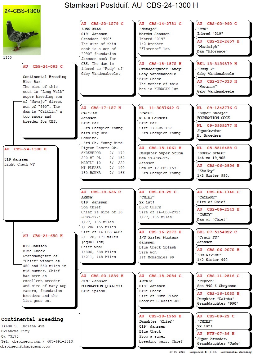 Sire: The sire of this cock is "Long Walk" super breeding son of "Navajo" direct son of "990". The dam is "Caitlin" a top racer and breeder for CBS.