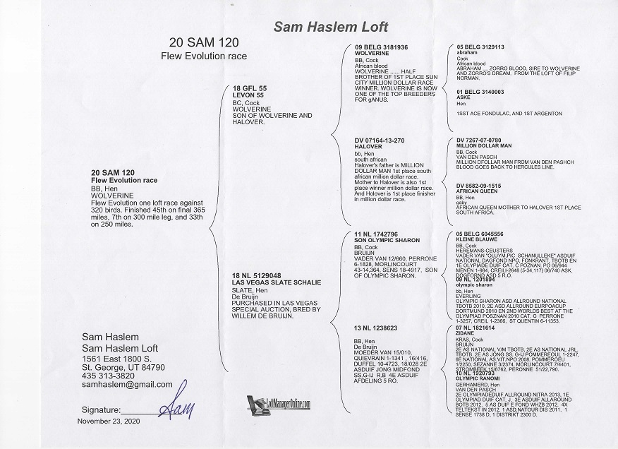 BEEN A SUPER HEN. BRED BY SAM HASLEM. SIRE IS GFL OUT OF WOLVERINE AND HALOVER. DAM WAS A DE BRUIJN IMPORT SOLD AT THE LAS VEGAS GALA. CHECK OUT THE PEDIGREE
