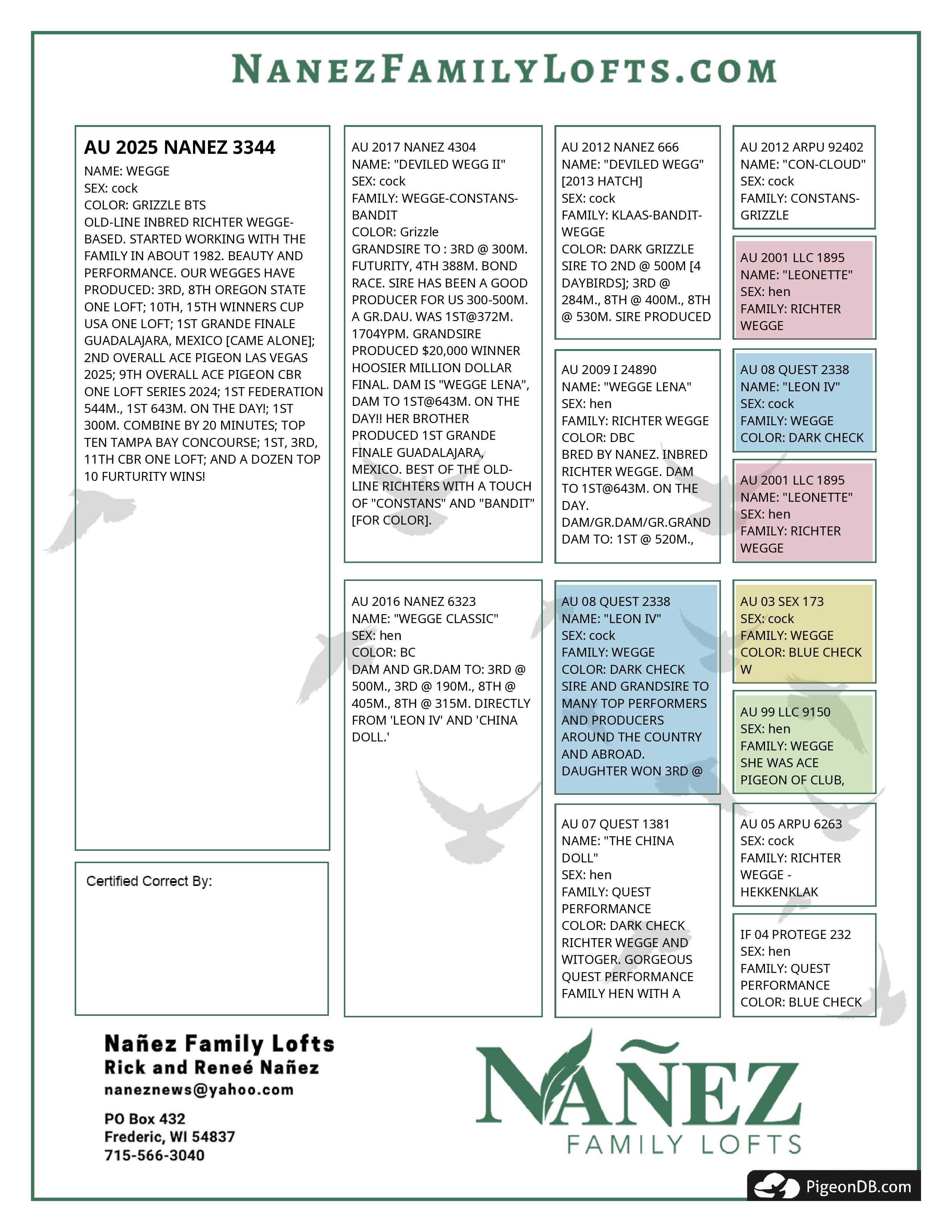 OLD-LINE INBRED RICHTER WEGGE-BASED. STARTED WORKING WITH THE FAMILY IN ABOUT 1982. BEAUTY AND PERFORMANCE. OUR WEGGES HAVE PRODUCED: 3RD, 8TH OREGON STATE ONE LOFT; 10TH, 15TH WINNERS CUP USA ONE LOFT; 1ST GRANDE FINALE GUADALAJARA, MEXICO [CAME ALONE]; 2ND OVERALL ACE PIGEON LAS VEGAS 2025; 9TH OVERALL ACE PIGEON CBR ONE LOFT SERIES 2024; 1ST FEDERATION 544M., 1ST 643M. ON THE DAY!; 1ST 300M. COMBINE BY 20 MINUTES; TOP TEN TAMPA BAY CONCOURSE; 1ST, 3RD, 11TH CBR ONE LOFT; AND A DOZEN TOP 10 FURTURITY WINS!