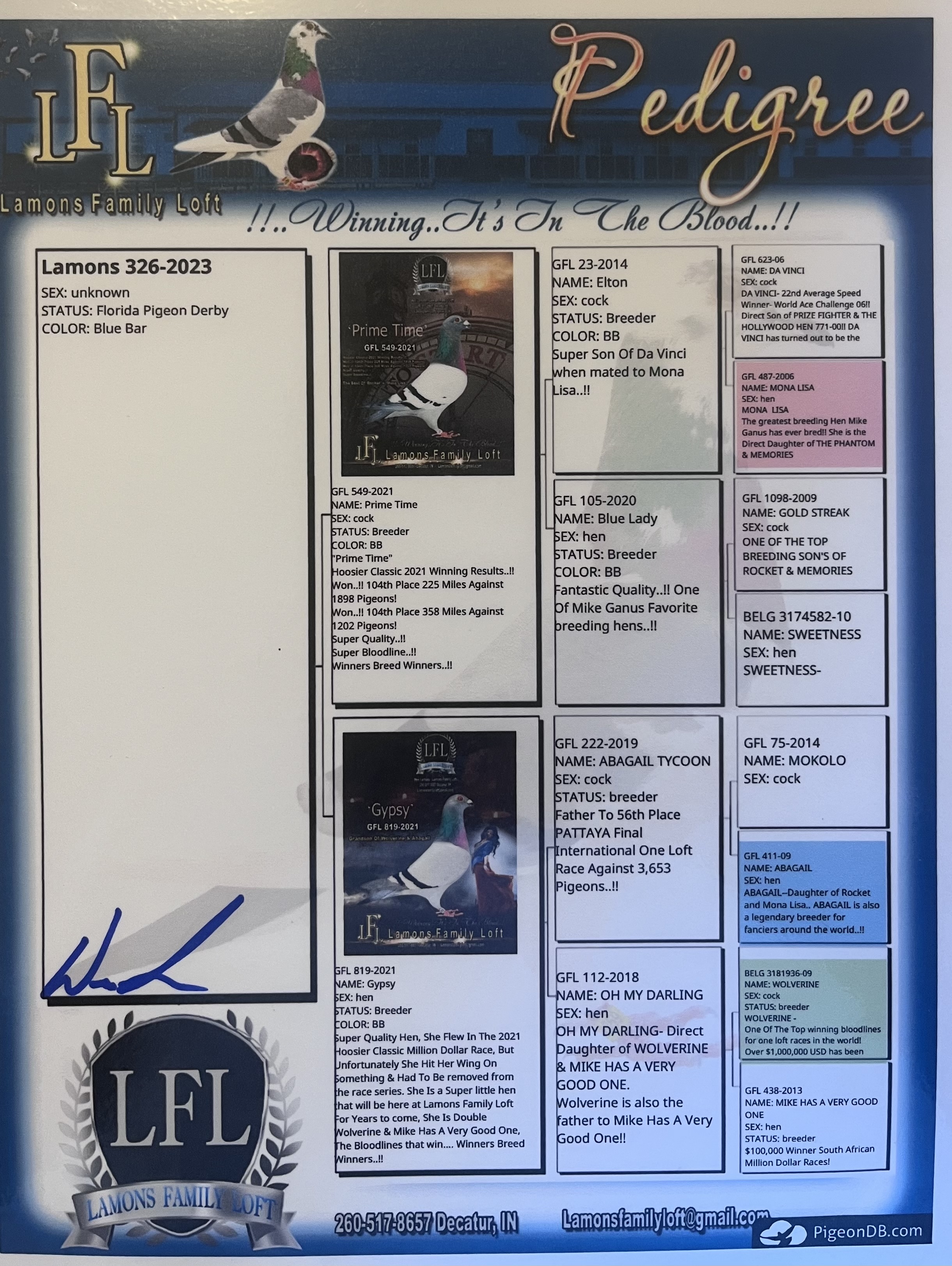 This gem is a stunning bird in my loft. She has an absolutely gorgeous eye, and a very noticeable muscle tone, and one whiteflight on each wing, which is so very beautiful! Her pedigree consists of some Ganus greats, like MHVGO, Mona Lisa, and even Abagail and Wolverine, this bird looks like Mona Lisa herself! Lamons birds have been winning everywhere so far in this OLR season, why not try one for yourself. When I purchased her as a yearling she caught my eye immediately. She is one of the best handling birds in my loft! I have a youngster in the Cotton Classic OLR right now, who is doing fantastic and actually just took 6 place on a very tough 150 mile race, winning me some money!