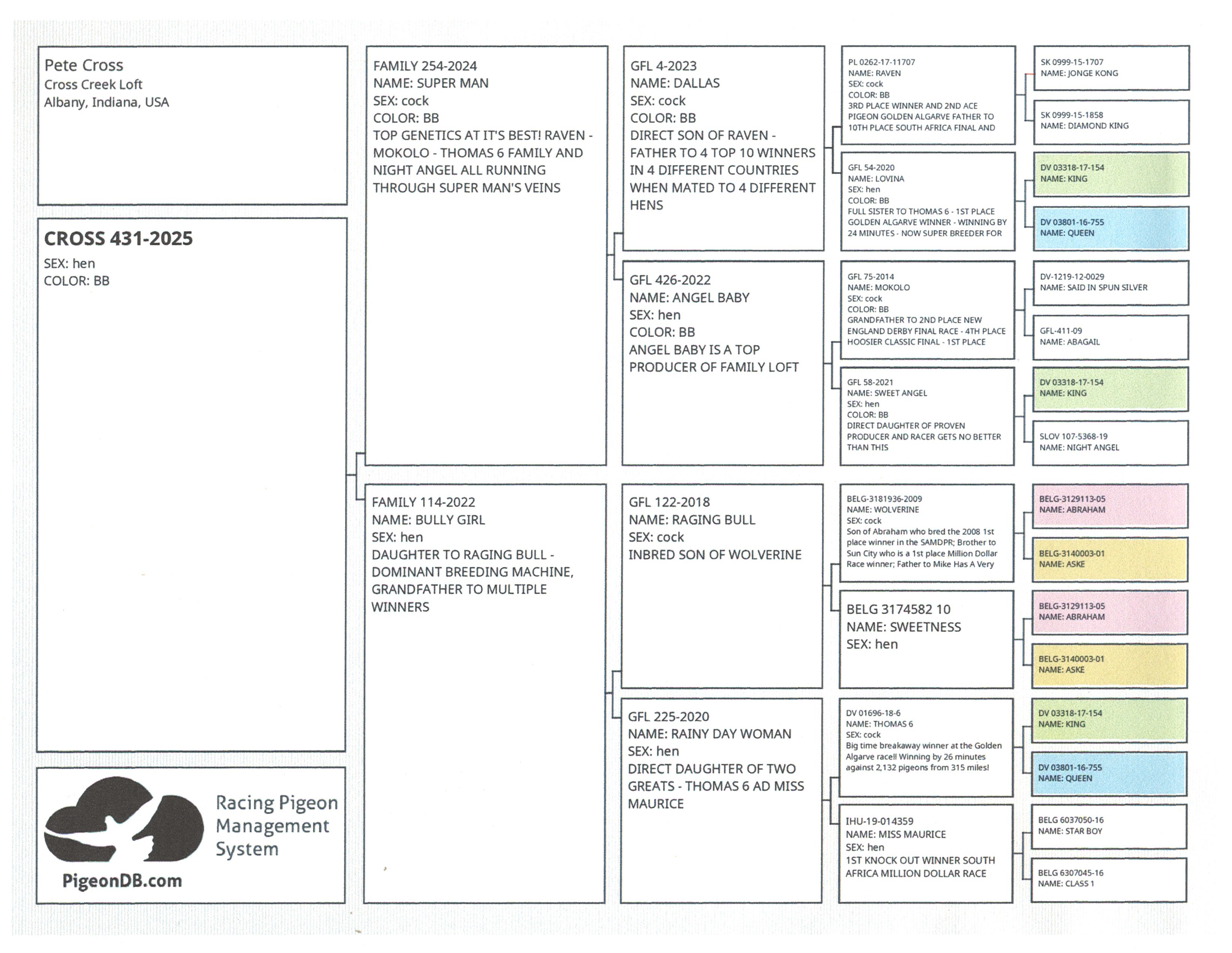 Cross 431-2025, "Super Girl," A beautiful hen! The Best of Family Loft with "Raven - Wolverine - Thomas 6"