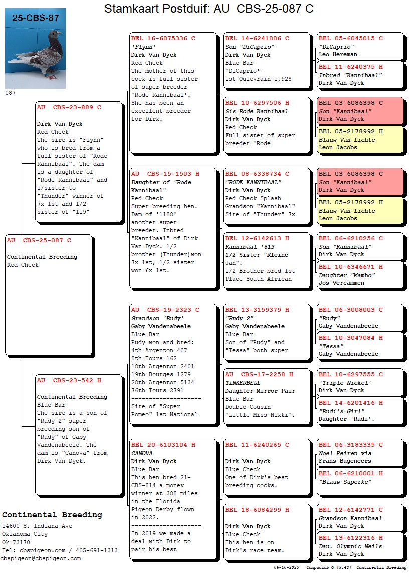 Sire: The sire is "Flynn" who is bred from a full sister of "Rode Kannibaal". The dam is a daughter of "Rode Kannibaal" and 1/sister to "Thunder" winner of 7x 1st and 1/2 sister of "119" winner of 6x 1st.