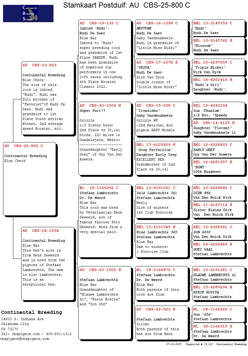 Sire: The sire of this cock is inbred "Rudi". Rudi was full brother of "Favoriet"of Rudi De Saer. Rudi was grandsire to 1st Place South african Winner, 2nd average speed Hoosier, etc.