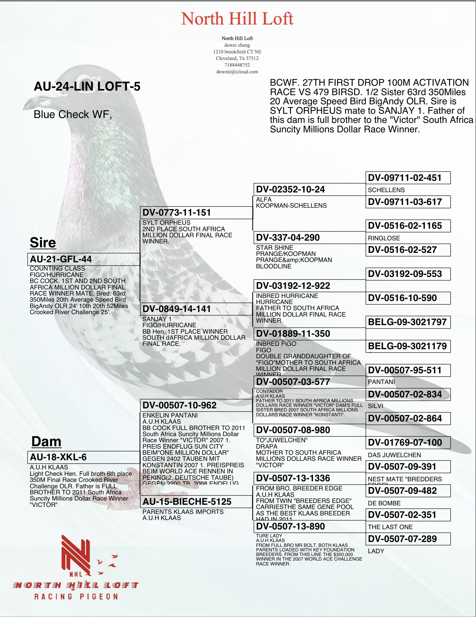 Bc Hen. She Flew Louisiana Perch OLR 2024. Father is GFL bird. SYLT ORPHEUS mate to SANJAY 1. Mother is daughter of full brother of "VICTOR" 1st place South Africa Million Dollar Winner 2011. She full sibling 6th place 350Miles Crooked River Challenge OLR. Check out the pedigree