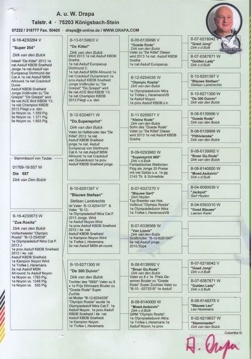 Great Hen direct A.u.W. Drapa. Father is son of KITTEL. Mother is daughter of DE 300 Duivin. Check out the pedigree.