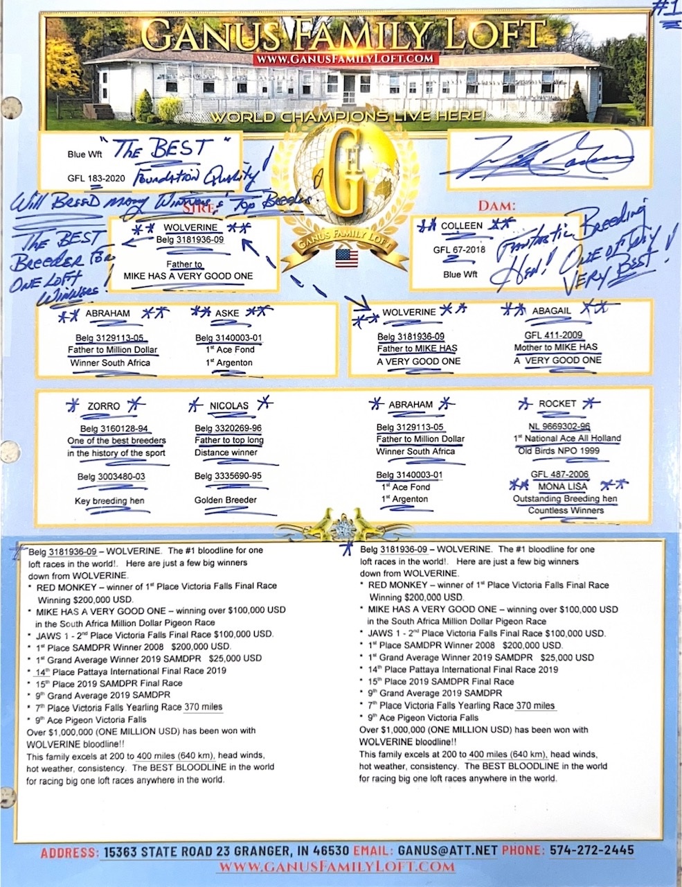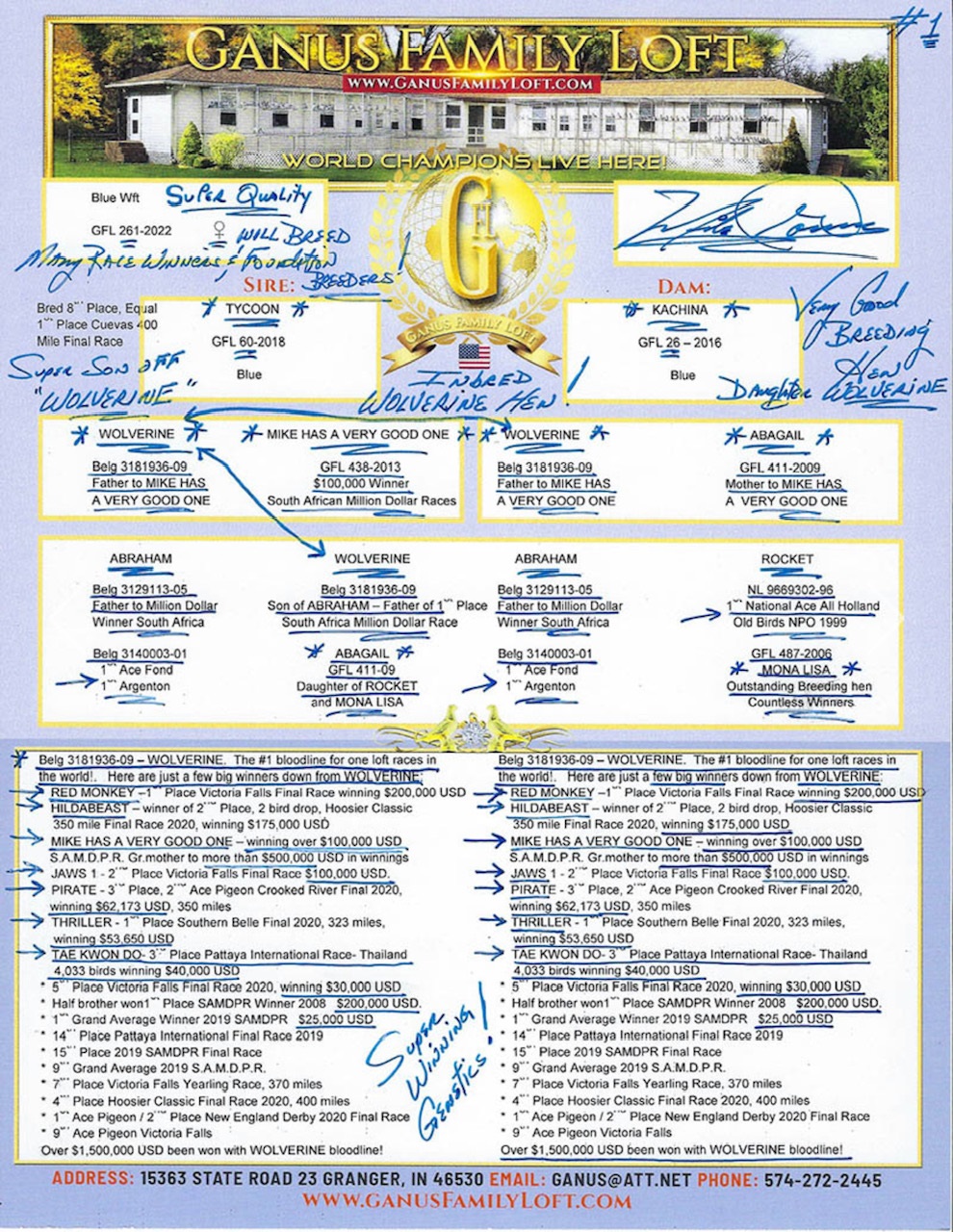 ** Over $ 1,000,000.00 USD have been won with the “Wolverine bloodline"! This Family excels at 200 to 400 Miles – 640 Km – Head winds and hot weather – consistency!