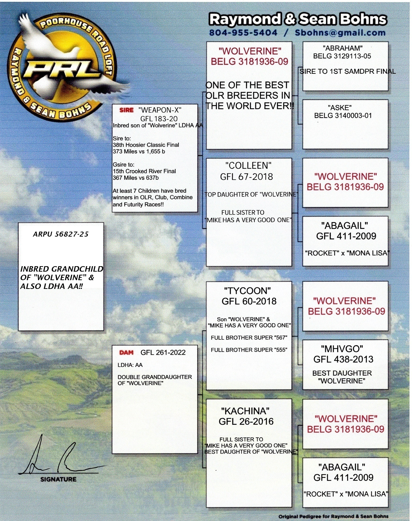 Sire: "Weapon-X" GFL 183-2020 LDHA AA SUPER Inbred son of "Wolverine" when mated back to “Colleen” his daughter and also full sister of “Mike has a very good one!! What a special bird and I can't thank Mike Ganus, Ganus Family Loft enough for allowing me and dad to purchase him!! He is already Sire and Gsire to big winners in BIG OLRs, Clubs and Combines!! TONS of his children are breeding winners!! The personal touch in Mike selecting him shows and we appreciate the over 25 years of purchasing quality birds dating all the way back to 1994 when dad bought his first couple from you! Thanks Mike!