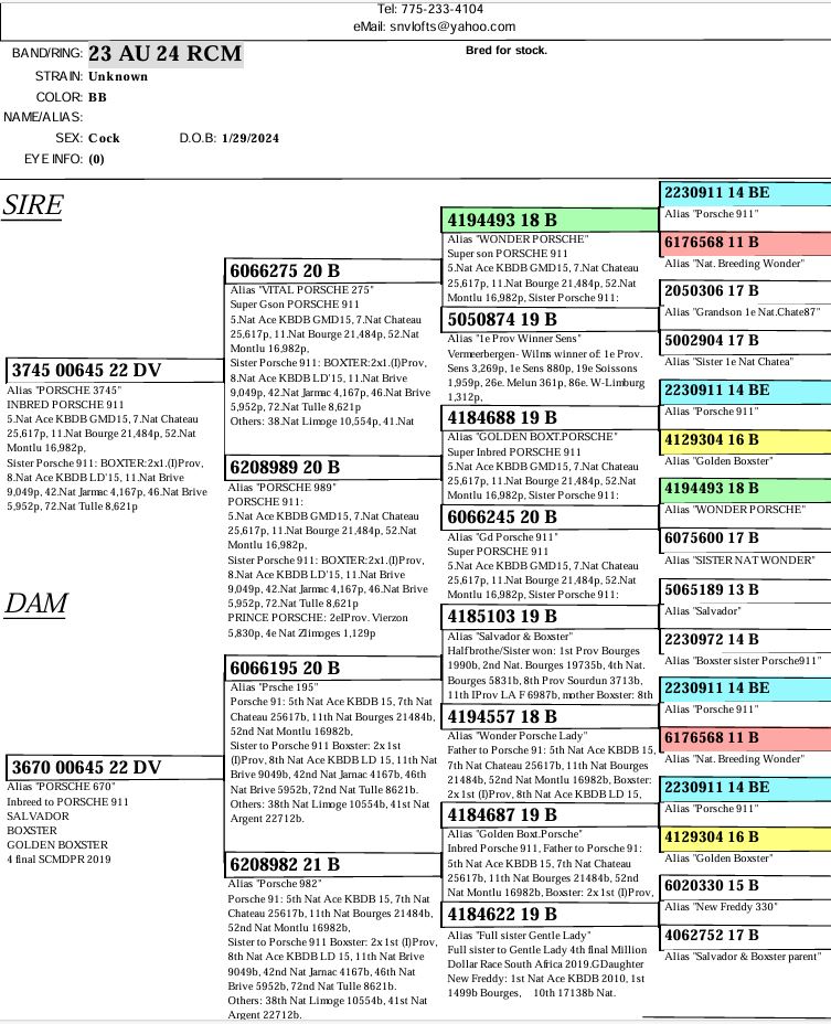 AU-24-RCM23 BBC, ready to breed. Please see Pedigree / parents pedigrees for more info. I cannot keep and breed them all due to a small loft. Giving someone a chance to breed and try!. Vaccinated for PMV / KM-1 also properly medicated to ensure health. Birds bred in individual walk-in breeding box / Pen / cage to ensure parentage. Bird will come with original pedigree. Birds sex not guarantee. Sorry about the picturesI need to adjust because it wont let me download more than 2.00MB so I have to cut it to make it smaller.