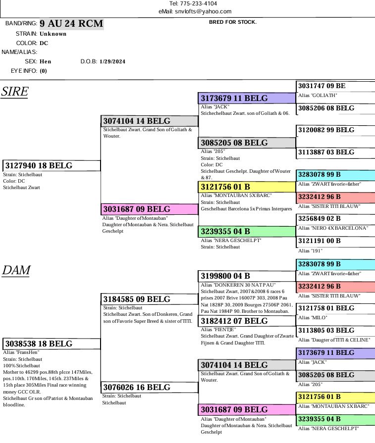AU-24-RCM-9 DCH, ready to breed. Please see Pedigree / parents pedigrees for more info. I cannot keep and breed them all due to a small loft. Giving someone a chance to breed and try!. Vaccinated for PMV / KM-1 also properly medicated to ensure health. Birds bred in individual walk-in breeding box / Pen / cage to ensure parentage. Bird will come with original pedigree. Birds sex not guarantee. Sorry about the picturesI need to adjust because it wont let me download more than 2.00MB so I have to cut it to make it smaller.