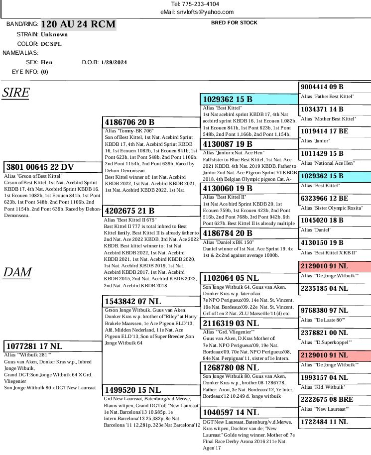 AU-24-RCM-120 DCWFH, ready to breed. Please see Pedigree / parents pedigrees for more info. I cannot keep and breed them all due to a small loft. Giving someone a chance to breed and try!. Vaccinated for PMV / KM-1 also properly medicated to ensure health. Birds bred in individual walk-in breeding box / Pen / cage to ensure parentage. Bird will come with original pedigree. Birds sex not guarantee. Sorry about the picturesI need to adjust because it wont let me download more than 2.00MB so I have to cut it to make it smaller.