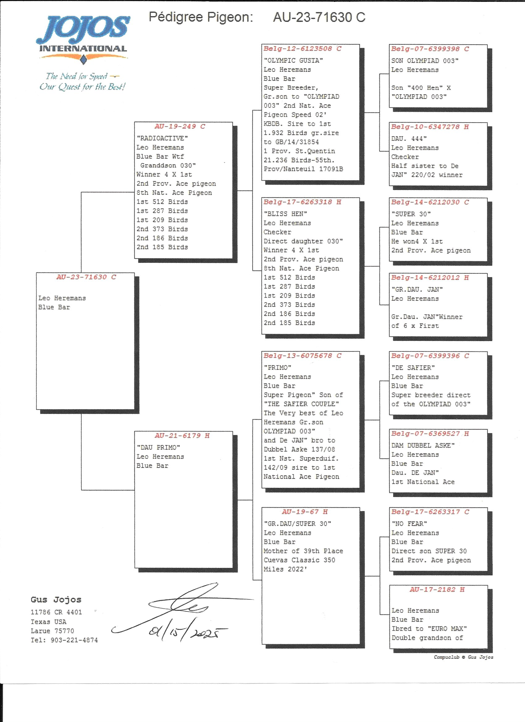 SIRE IS “RADIO ACTIVE” A SUPER BREEDING COCK FOR JOJO SON OF THE GREAT “OLYMPIC GUSTA” AND THE “ BLISS HEN”