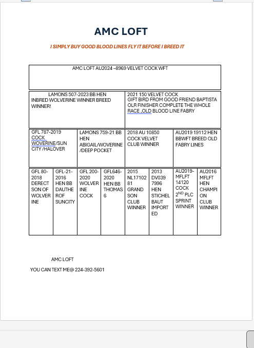AMC LOFT AU2024 8969 FULL SIBLING OF THIS BIRD IS A FINAL WINNER 2024 AT THE HOOSIER CLASIC 270 pl@ 360m, 77 pl @ 300m