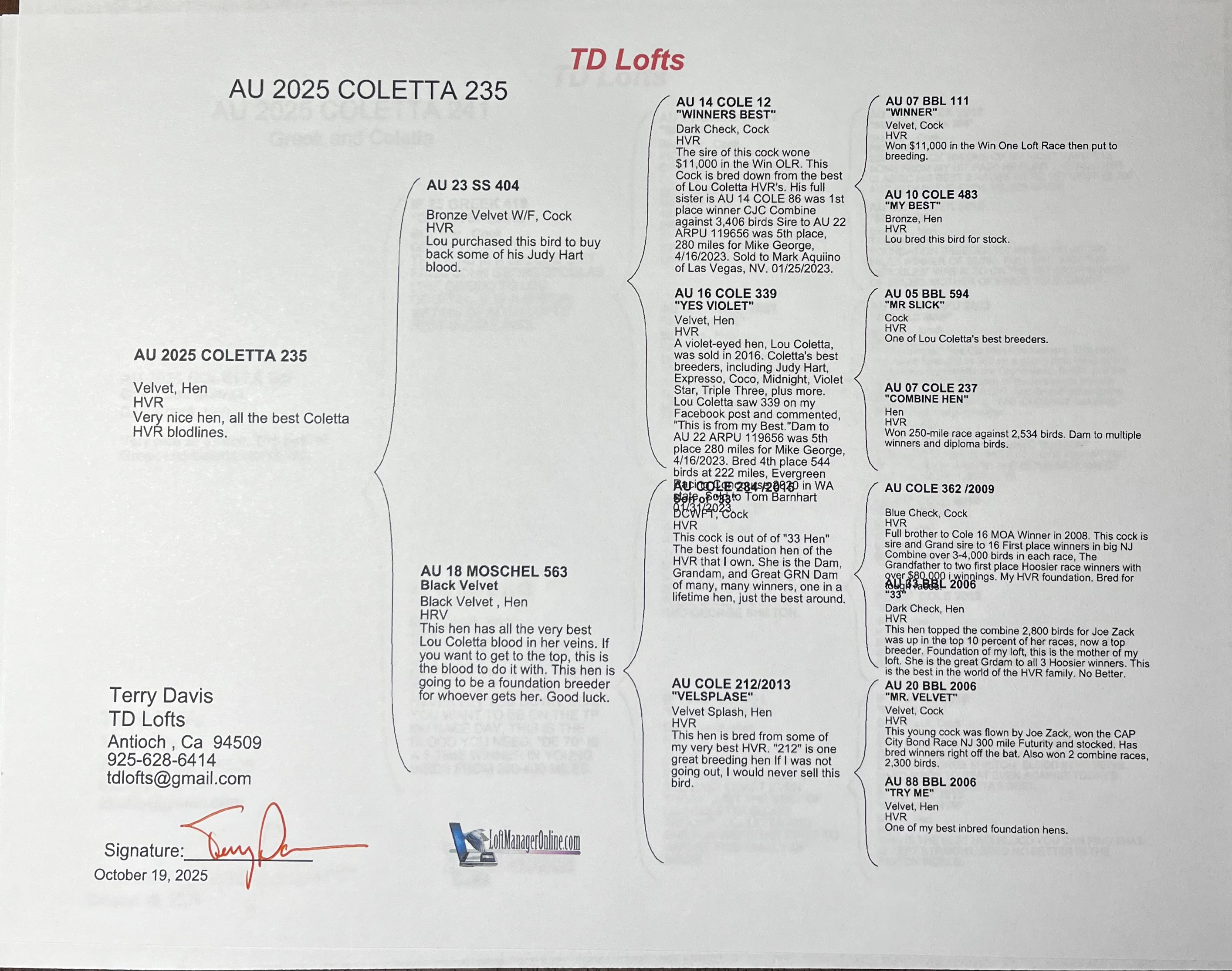 Very nice HVR Hen, small to medium Velvet hen. All the best of Lou Coletta's bloodlines. Don't miss this one.