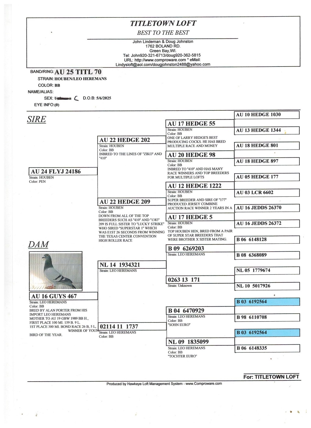 This is a very nice bird. Leo Herman's hen was bred by Alan Porter. Houben is from the loft of Tony Jordan.