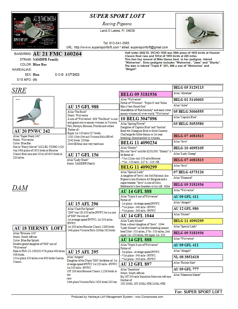 Half sister 2022 EL VICHO 1520 was 56th place of 1655 birds at Hoosier Classic final race and 101st of 1955 birds at 220 miles.