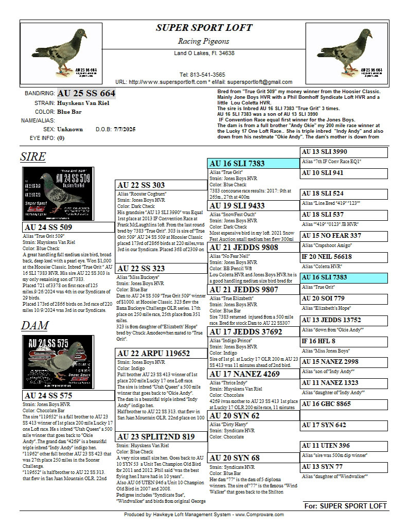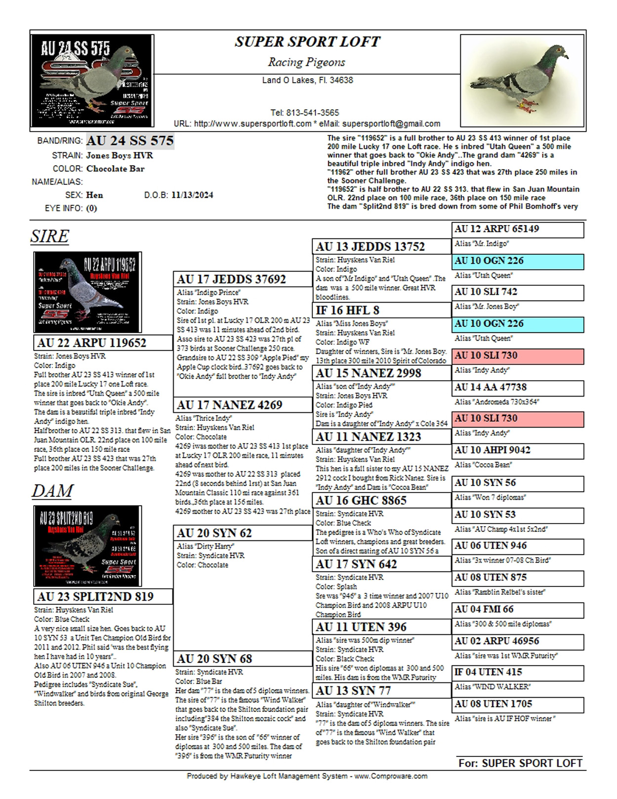 The dam is from a full brother "Andy Okie" my 200 mile race winner at the Lucky 17 One Loft Race.. She is triple inbred "Indy Andy" and also down from his nestmate "Okie Andy". The dam's mother is down from some of Phil Bomhoff's Syndicate Loft best HVR birds.