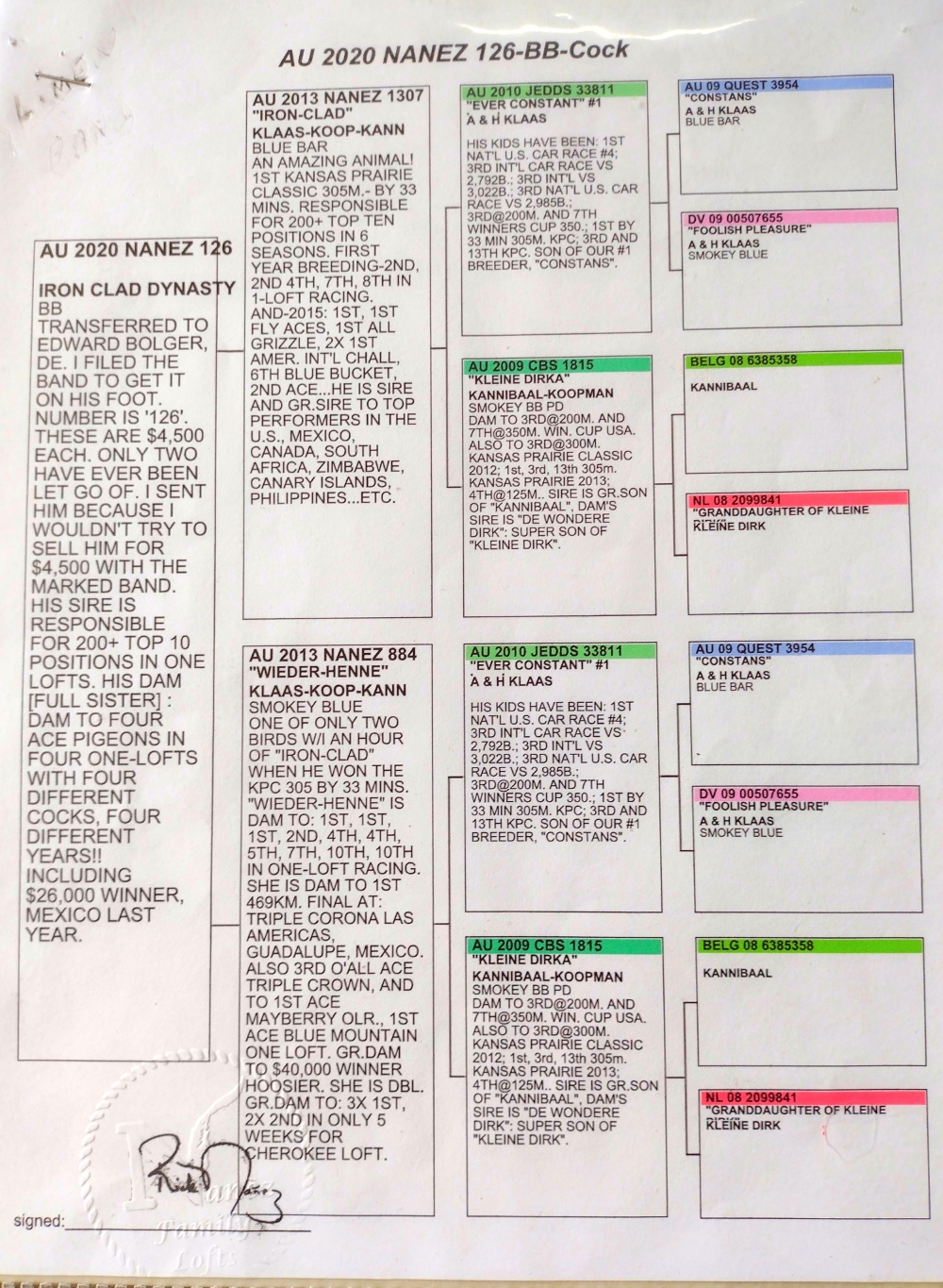 The sire of this hen is a 2020 direct acquisition from Nanez Family Loft, bred from Rick Nanez’s elite Iron Clad Dynasty line a proven bloodline responsible for over 200 Top 10 finishes in major One Loft Races. The sire’s dam is a full sister to four different Ace Birds, each paired with different cocks over four years, including the breeder of a $25,000 winner in Mexico.