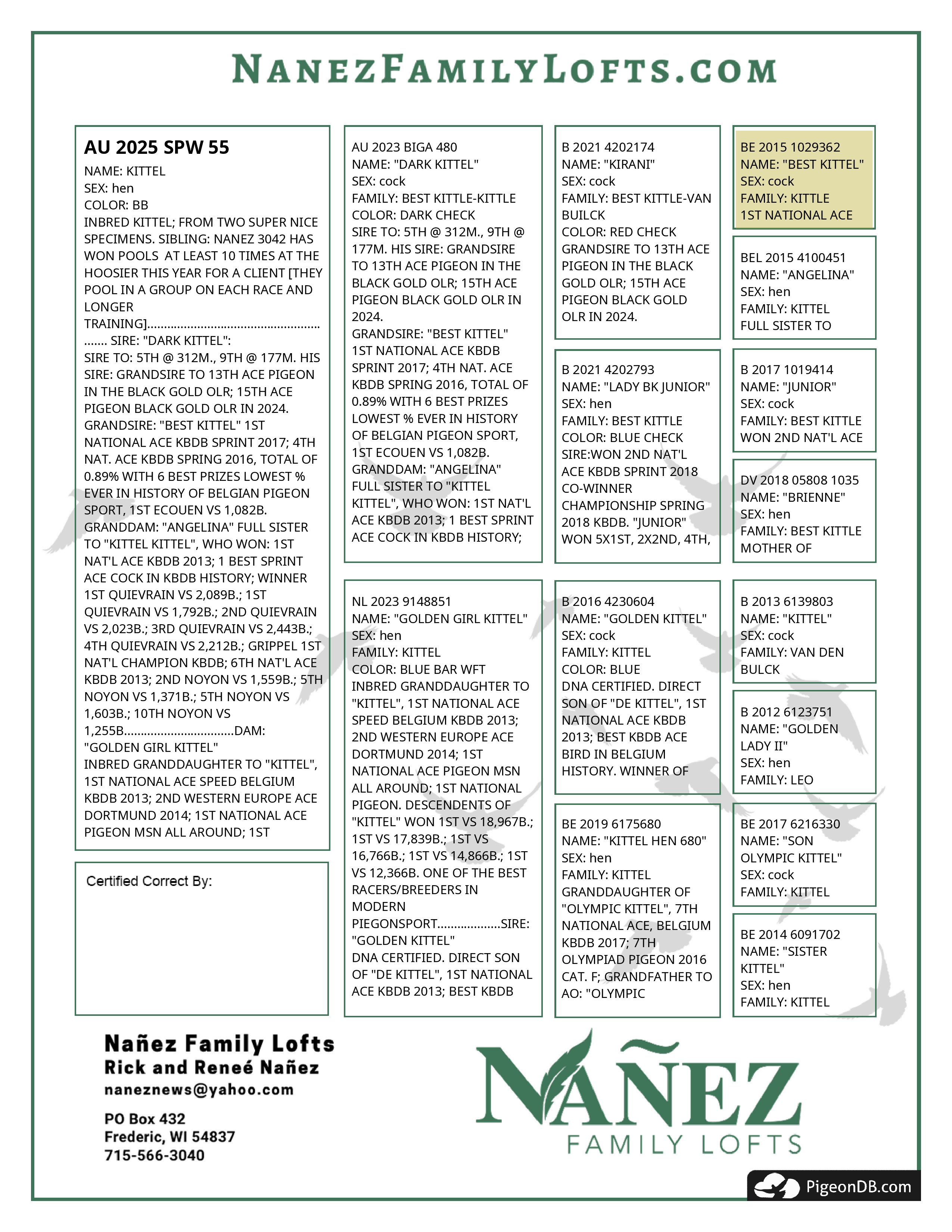 SIRE TO: 5TH @ 312M., 9TH @ 177M. HIS SIRE: GRANDSIRE TO 13TH ACE PIGEON IN THE BLACK GOLD OLR; 15TH ACE PIGEON BLACK GOLD OLR IN 2024. GRANDSIRE: "BEST KITTEL" 1ST NATIONAL ACE KBDB SPRINT 2017; 4TH NAT. ACE KBDB SPRING 2016, TOTAL OF 0.89% WITH 6 BEST PRIZES LOWEST % EVER IN HISTORY OF BELGIAN PIGEON SPORT, 1ST ECOUEN VS 1,082B. GRANDDAM: "ANGELINA" FULL SISTER TO "KITTEL KITTEL", WHO WON: 1ST NAT'L ACE KBDB 2013; 1 BEST SPRINT ACE COCK IN KBDB HISTORY; WINNER 1ST QUIEVRAIN VS 2,089B.; 1ST QUIEVRAIN VS 1,792B.; 2ND QUIEVRAIN VS 2,023B.; 3RD QUIEVRAIN VS 2,443B.; 4TH QUIEVRAIN VS 2,212B.; GRIPPEL 1ST NAT'L CHAMPION KBDB; 6TH NAT'L ACE KBDB 2013; 2ND NOYON VS 1,559B.; 5TH NOYON VS 1,371B.; 5TH NOYON VS 1,603B.; 10TH NOYON VS 1,255B................................