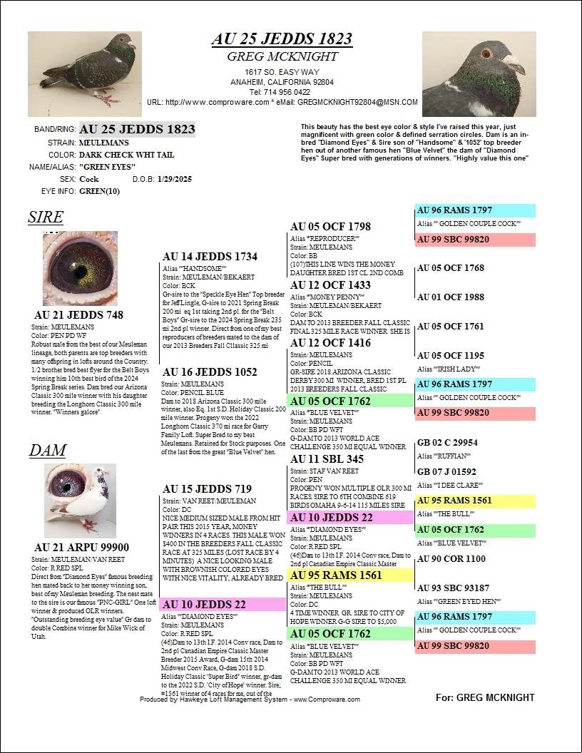"THIS BLACK CHECK WHITE-TAILED MALE IS ONE OF THE BEST I'VE RAISED ALL SEASON" HIS STYLE IS PERFECT WITH EYES OF DISTINCTION, ALONG WITH A WINNING PEDIGREE MAKES THIS ONE A VERY SPECIAL STOCK BIRD. HIS EYES ARE THE BEST I'VE RAISED THIS YEAR, IF YOUR AN EYE ENTHUSIAST THEN THIS ONE IS SPECIAL & GUARANTEE YOU DON'T HAVE A BETTER ONE AT THIS AGE IN YOUR LOFT. "GREEN EYES" HAS A PARTIAL WHITE TAIL & SADDLE BACK. CHECK OUT THE ATTACHED PICTURES OF PARENTS & GR-PARENTS SHOWING YOU THE QUALITY OF THIS BIRD WITH GENERATIONS OF WINNERS THRU OUT PEDIGREE. "REMEMBER IF YOU BREED HIM TO ANOTHER WITH THE REC RED GENE, GOOD CHANCE 50% OF OFFSPRING WILL BE REC REDS" THESE MEULEMANS ARE SO SPECIAL AS A CROSS WITH THERE SUPERIOR COLORS & STYLE IMPACT ANY LOFT. YOU JANSSEN LOVERS THIS IS THE BIRD FOR YOU & REMEMBER THESE MUELEMANS ARE HALF JANSSEN ANYWAY. ANY QUESTIONS PLEASE CALL/TEXT ME AT 714 469 2557 THANK YOU IN ADVANCE. BID WITH CONFIDENCE. GOOD LUCK. SINCERELY, GREG MCKNIGHT.