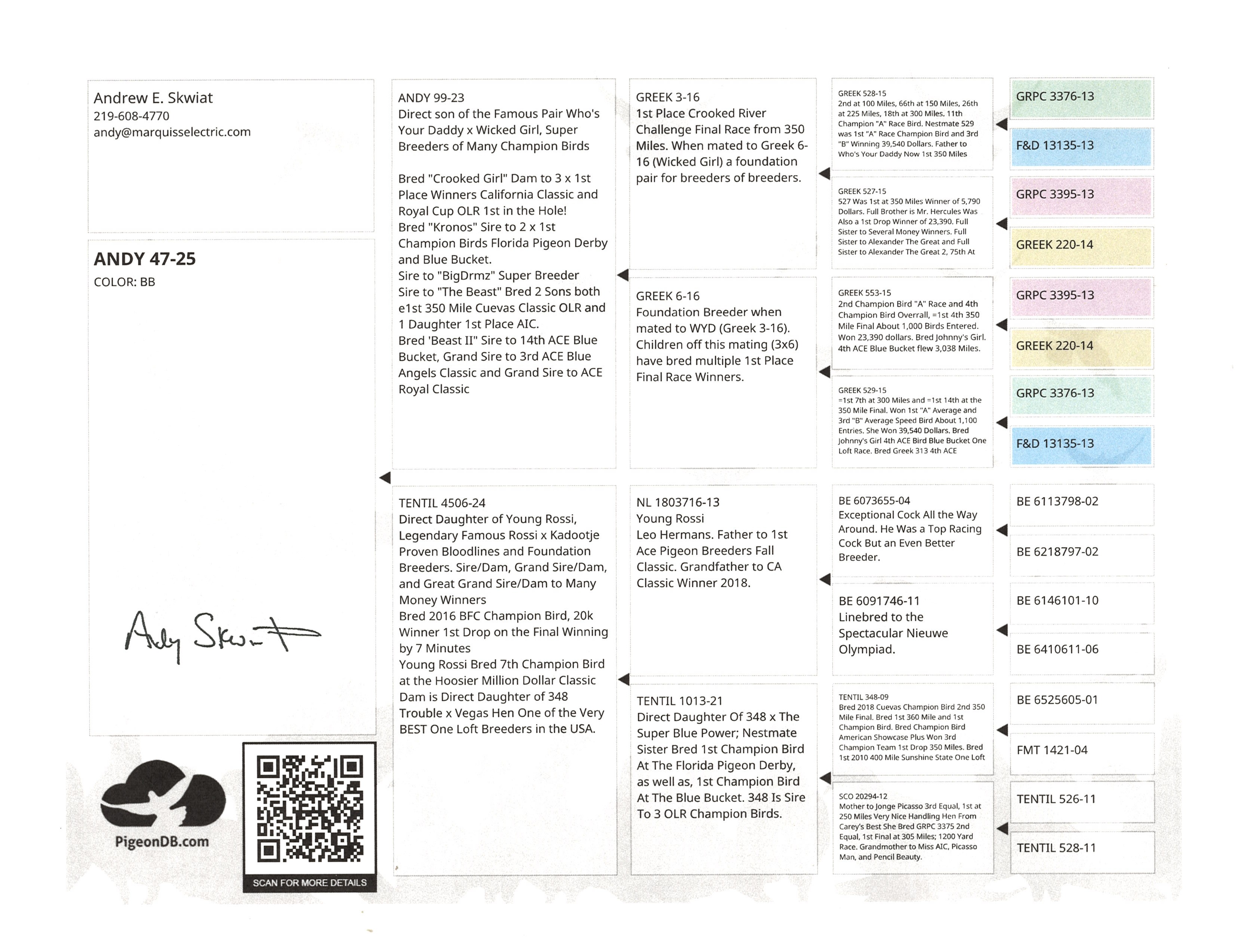 Father - Andy 89-2023, Direct son of super breeding couple for Greek Connection Loft, "Who's Your Daddy," 1st Place winner Crooked River 350 Mile Final. He was also 2nd at the 200 mile. Most importantly he is a super producer. Especially when paird to "Wicked Girl,"