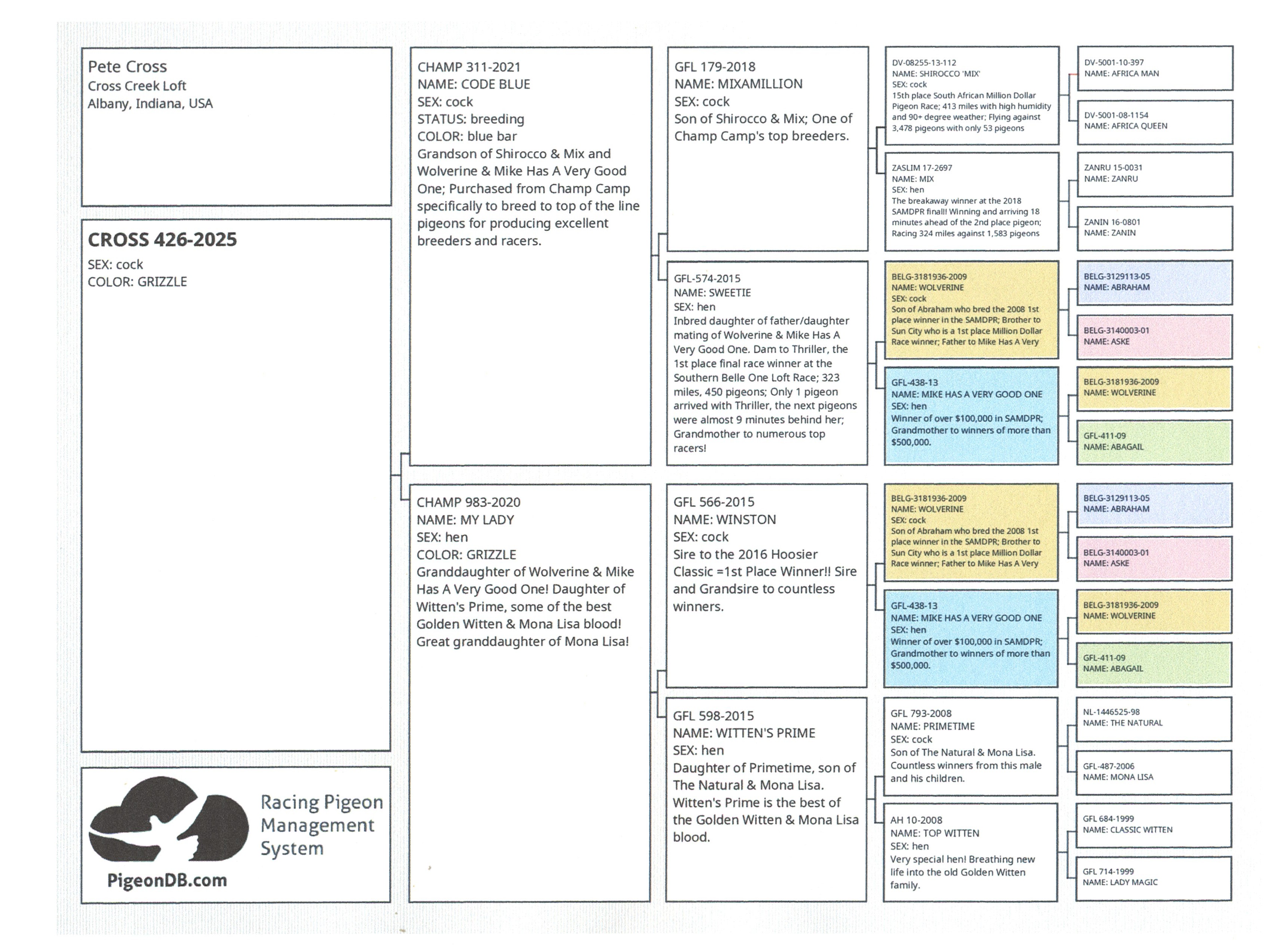 Father - Champ 31-2021, "Code Blue," Gr. Son of Shirocco x Mix and Wolverine x Mike Has A Very Good One. One Loft Racing Royalty all in one pedigree.