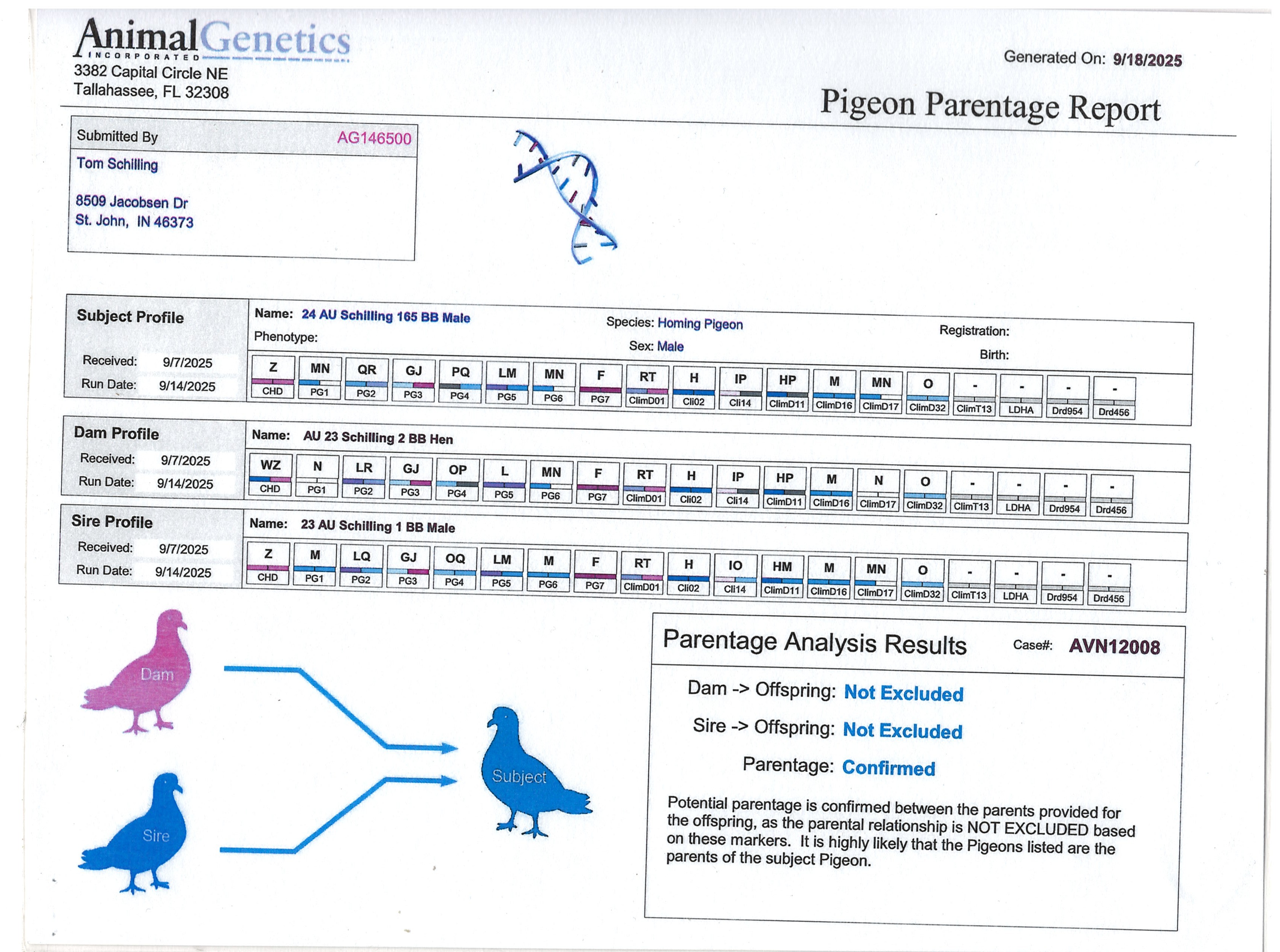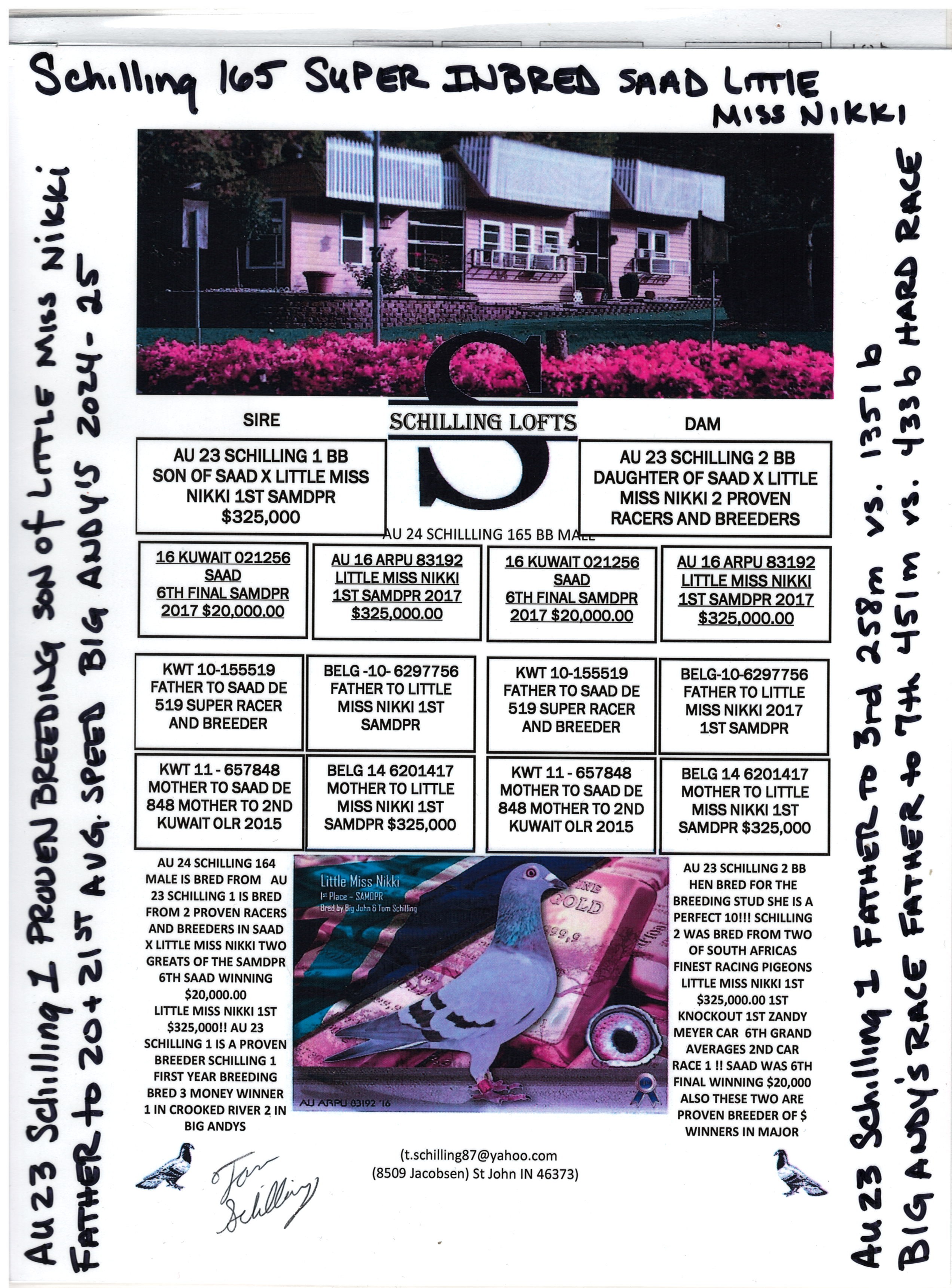 Tom Schillking - "Schilling Loft" is a long time fancier and winner of the SAMDPR in 2017. His winning Hen "Little Miss Nikki," won the largest prize ever in the SAMDPR, winning $325,000. As if this wasn't enough, Miss Nikki came back to the USA and hit the ground running, producing offspring that wins and produce winners. Schilling Loft and his clients have had super success in many of the One Loft Races, including Hoosier Classic, Big Andy's OLR, BGR, California Classic, Crooked River, Victoria Falls, Cuevas Classic.
