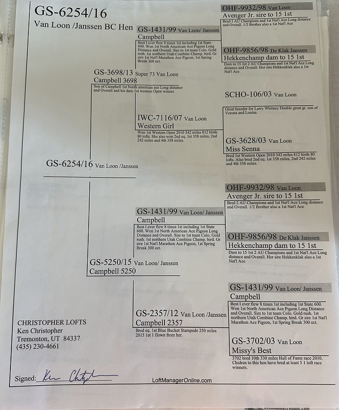 6254 is a fantastic medium size hen , she's an intelligent calm bird with a solid body strong back one pin tail super wing and a very nice chestnut eye . She's a proven breeder , her offsprings do great at 300-400 mile Futurity Races .