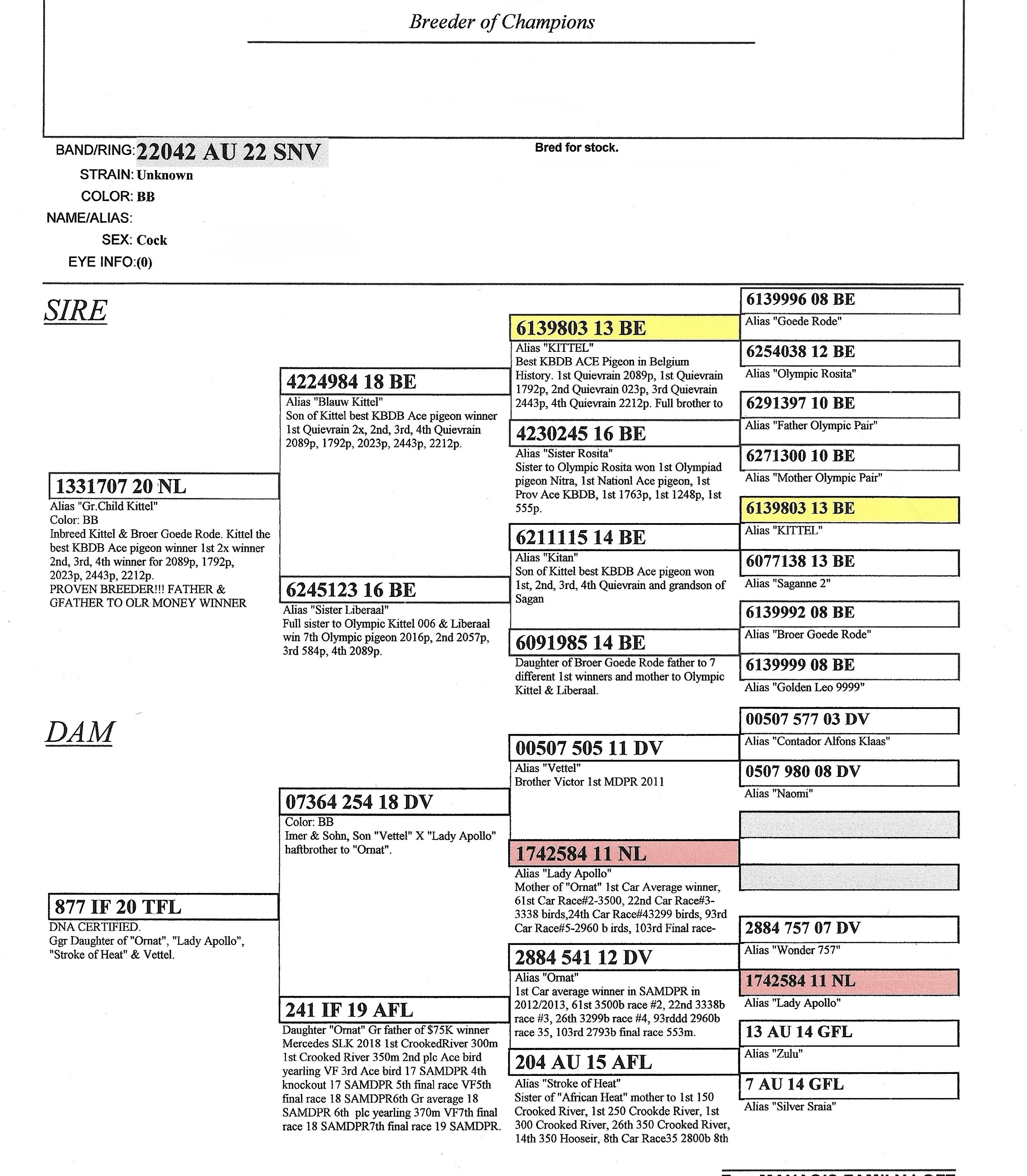 Off Proven Breeder Sire is father and gfather to OLR money winners!!!. AU-22-SNV 22042 BB Cock ready to breed. Please see Pedigree / parents’ pedigrees for more info...