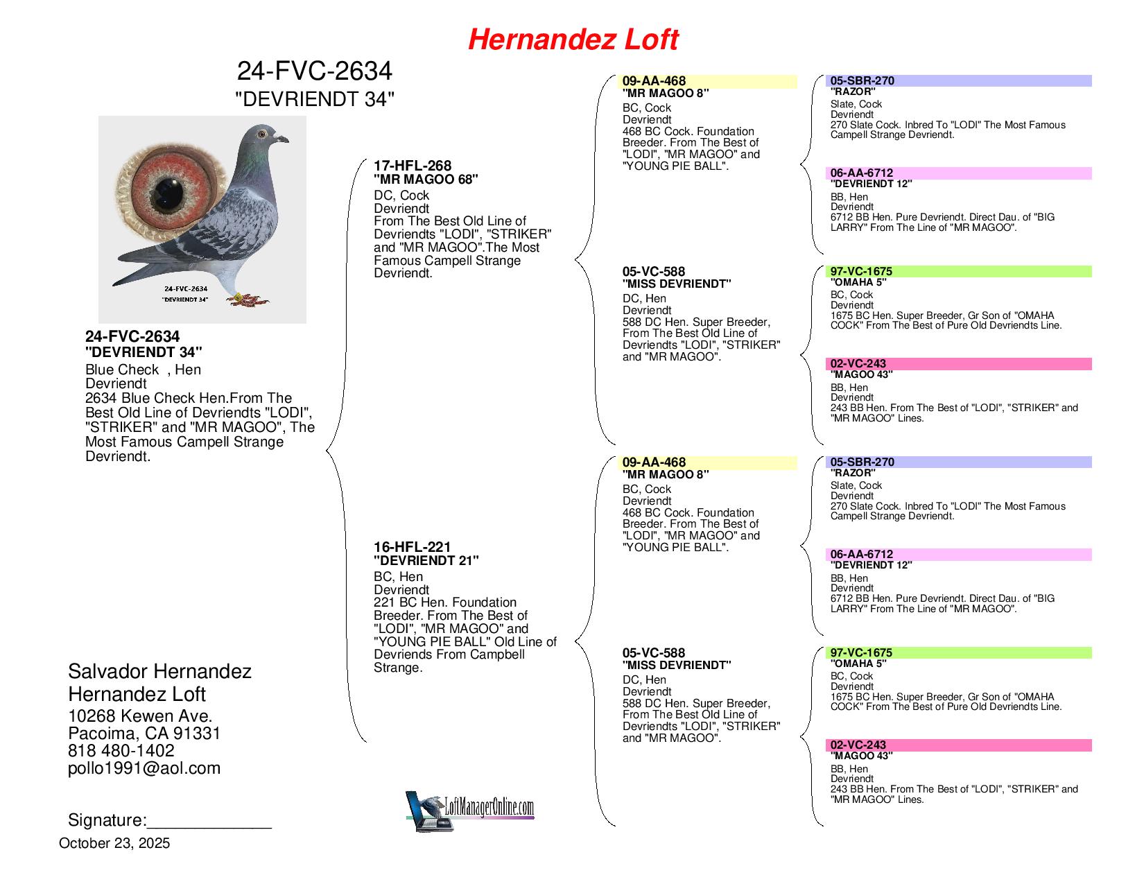 24-FVC-2634 Blue Check Hen. Best of Devriendts Line of "MR MAGOO" Old Line From OHF. Proven Bloodline Can Fly 300 Miles and Up.