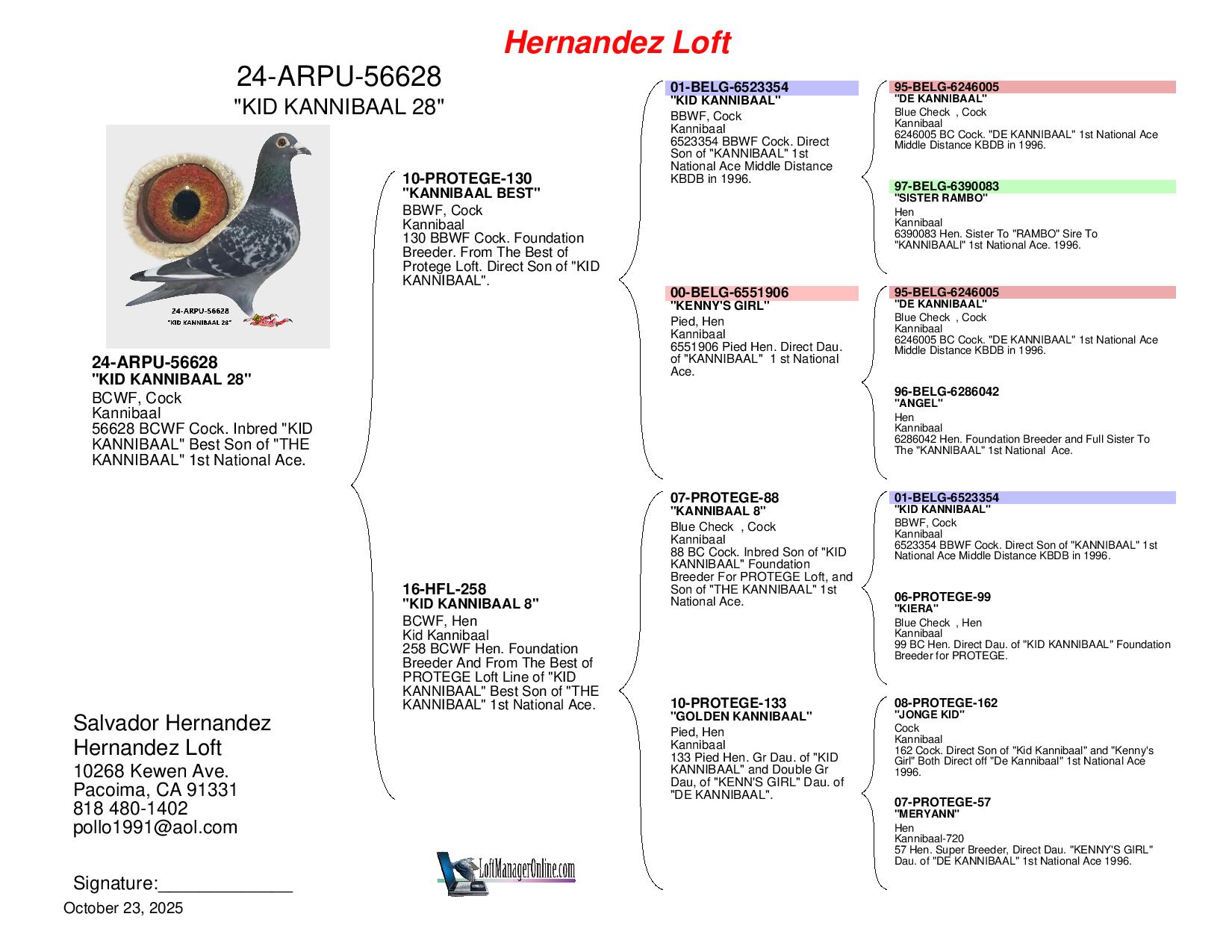 24-ARPU-56628 BCWF COCK . Inbred GSon of "KID KANNIBAAL" Foundation Breeder For PROTEGE Loft, and Son of "THE KANNIBAAL" 1st National Ace.