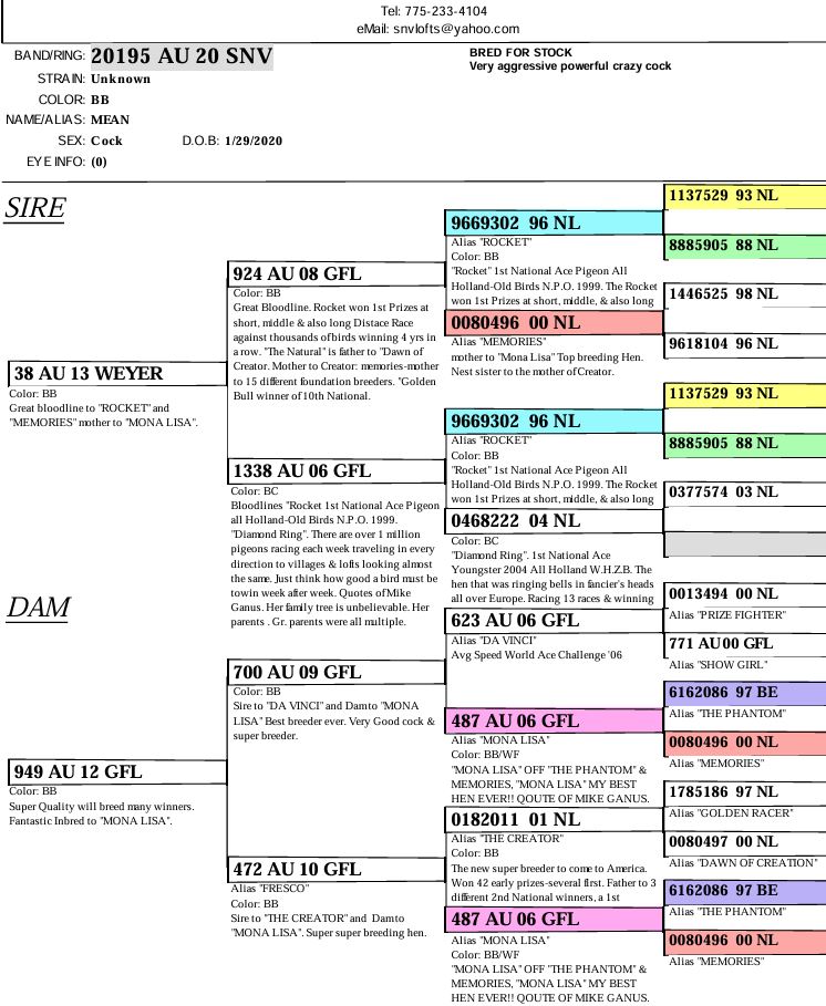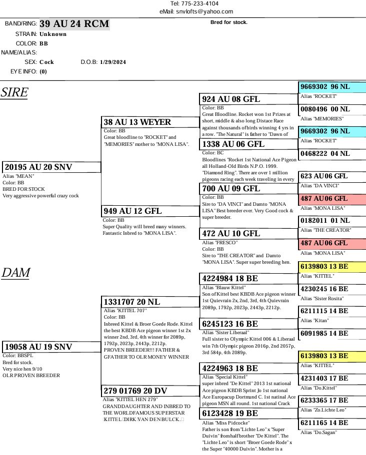AU-24-RCM-39 BBC, ready to breed. Please see Pedigree / parents pedigrees for more info. I cannot keep and breed them all due to a small loft. Giving someone a chance to breed and try!. Vaccinated for PMV / KM-1 also properly medicated to ensure health. Birds bred in individual walk-in breeding box / Pen / cage to ensure parentage. Bird will come with original pedigree. Birds sex not guarantee. Sorry about the picturesI need to adjust because it wont let me download more than 2.00MB so I have to cut it to make it smaller.
