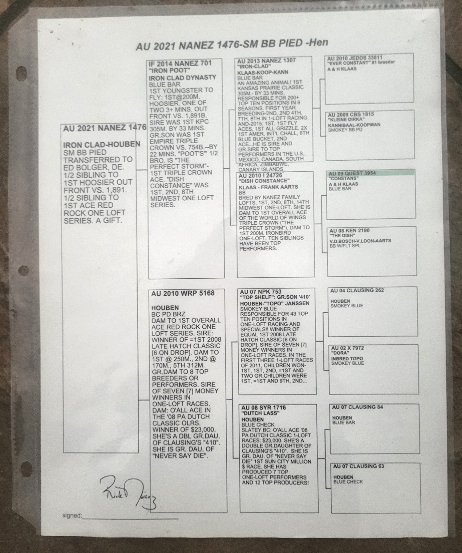 Mother: Direct from Rick Nanez Iron Clad Houben line, known for toughness, consistency, and long-distance stamina. Half-siblings include 1st HOOSIER Out-Front and 1st Ace Red Rock One Loft Series.