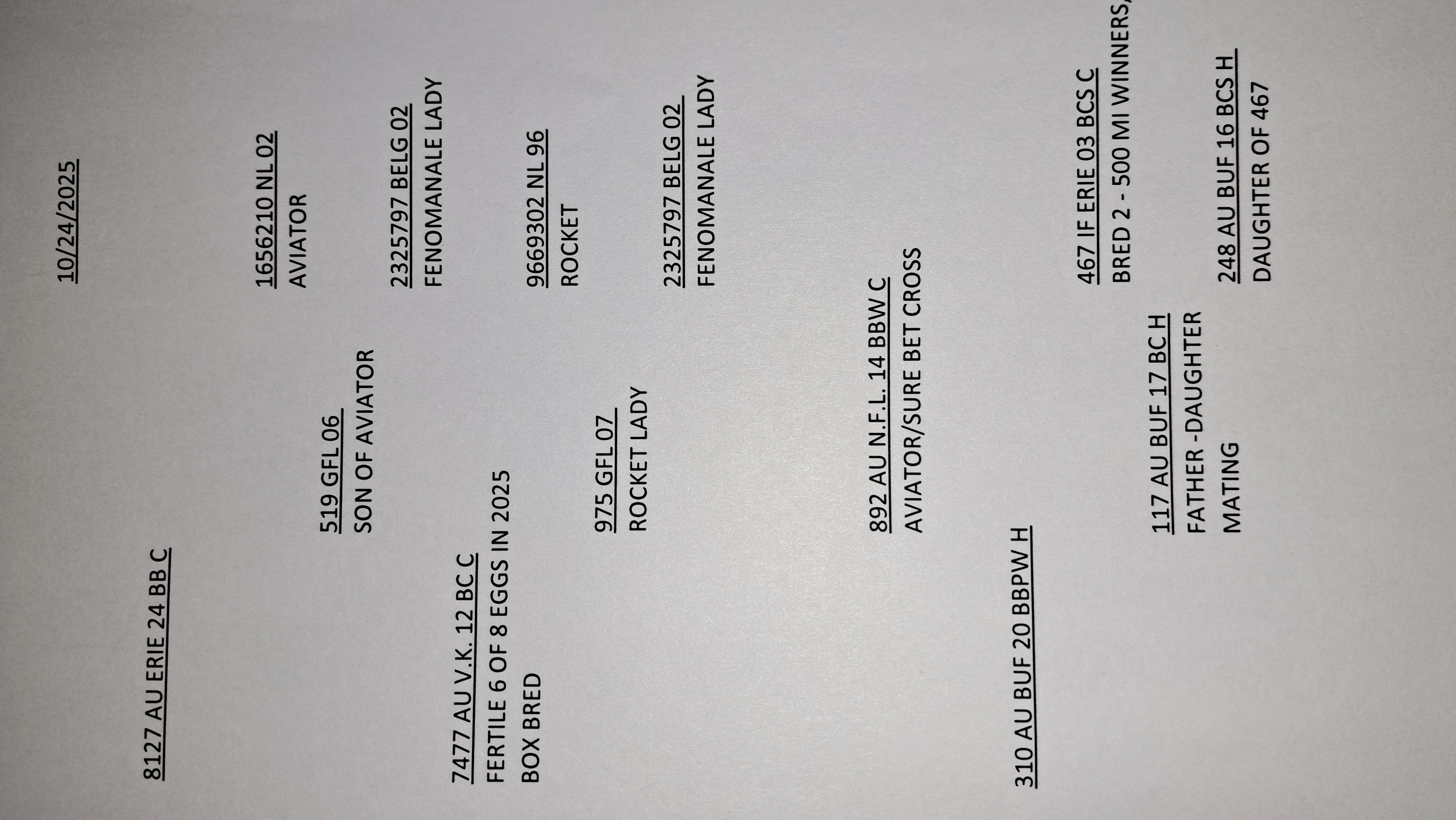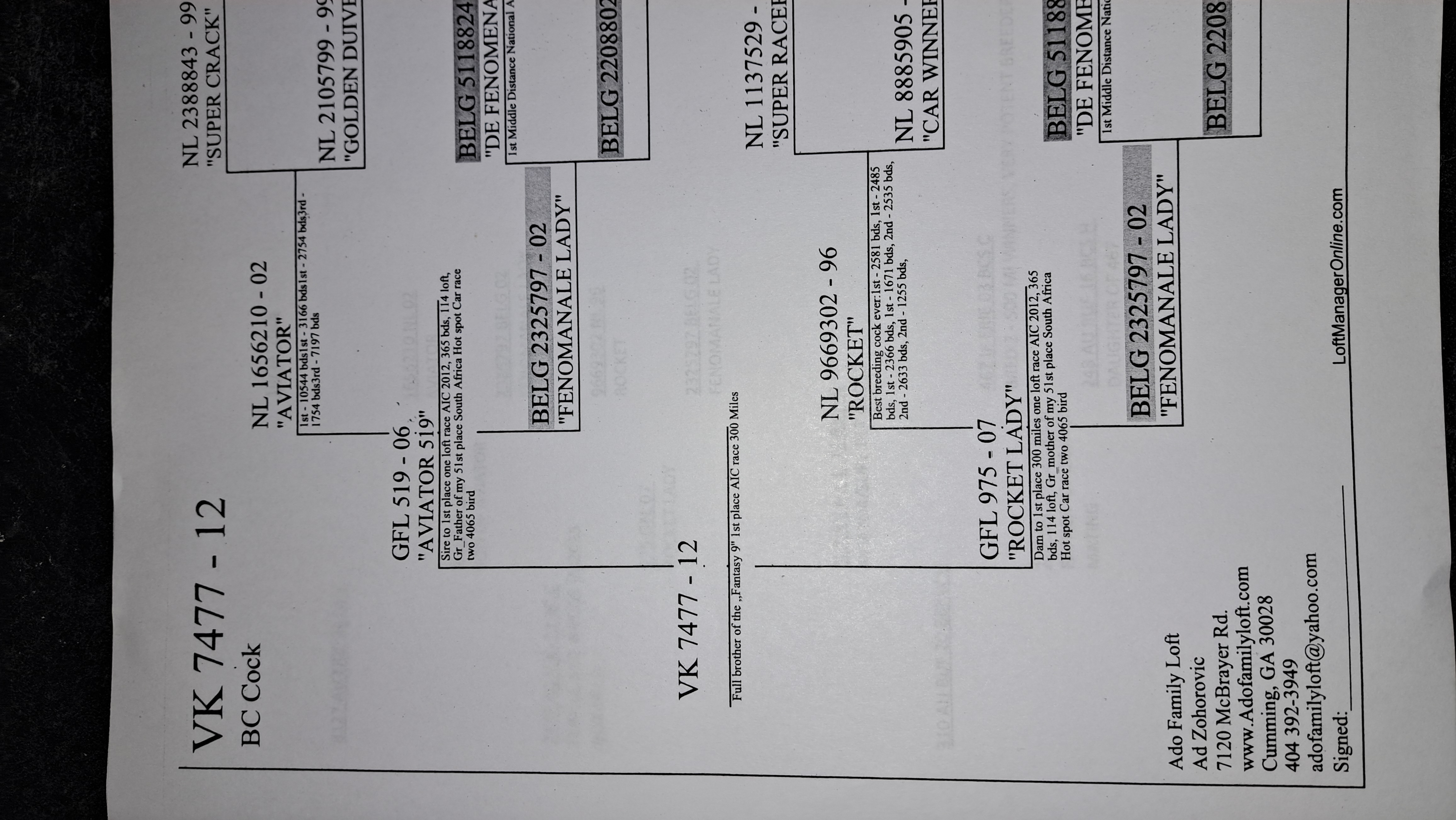 Sire 7477 AU VITA KING 12 BC C is a grandson of the famous AVIATOR. 13 years young and still fertiling eggs for me. His 2 sisters completed the 4 bird race series for the Jerry's OLR in 2024.