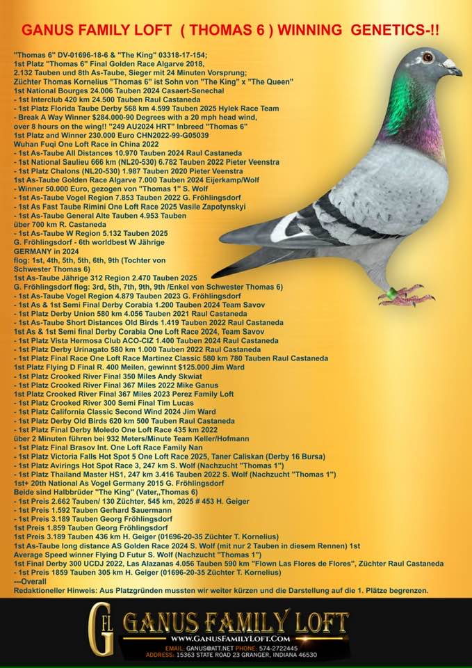 BEST OF THOMAS 6 X NIGHT ANGEL PARENTS DIRECT FROM GANUS LOFT AUCTION IS FOR A BIRD DIRECT OFF THESE TWO SUPER BIRDS ! ''THOMAS 3RD'' DIRECT GANUS LOFT OUR TOP BREEDER