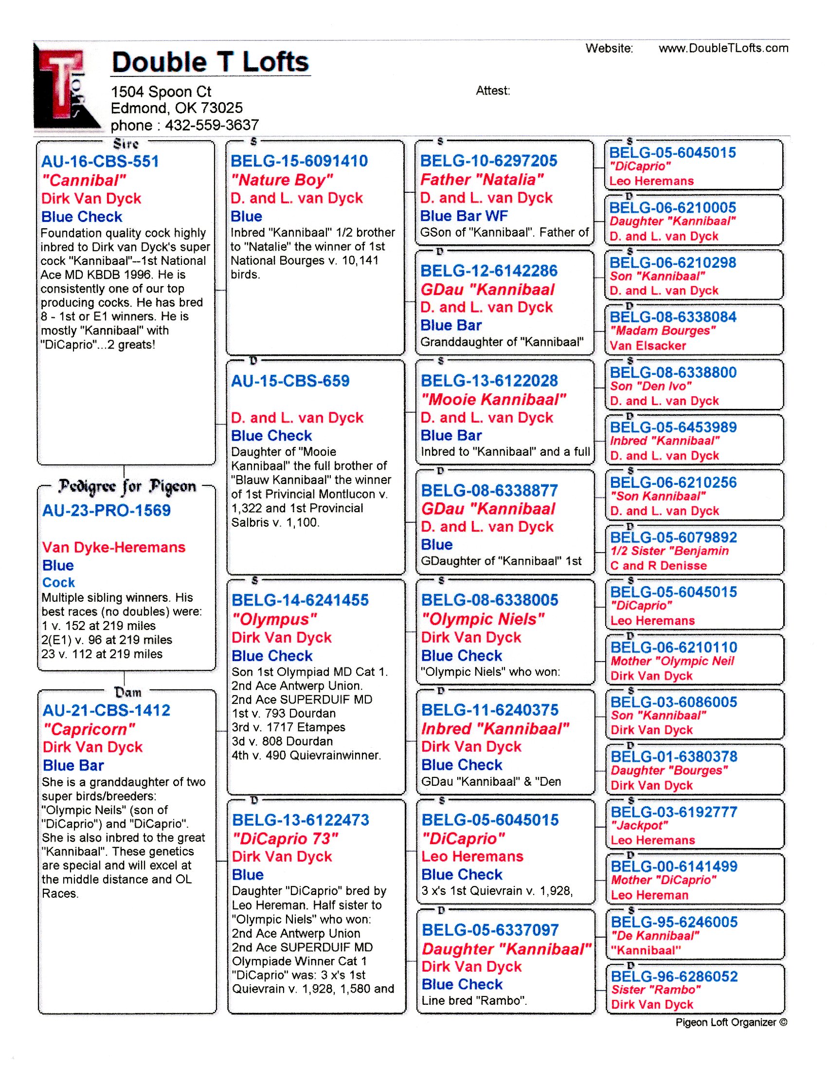 Sire: AU-16-CBS-551 “Cannibal” – Dirk Van Dyck cock that is inbred to “de Kannibaal” the 1st National Ace MD KBDB 1996. He is also a great-great-grandson of “DiCaprio”. He is one of our best breeders.